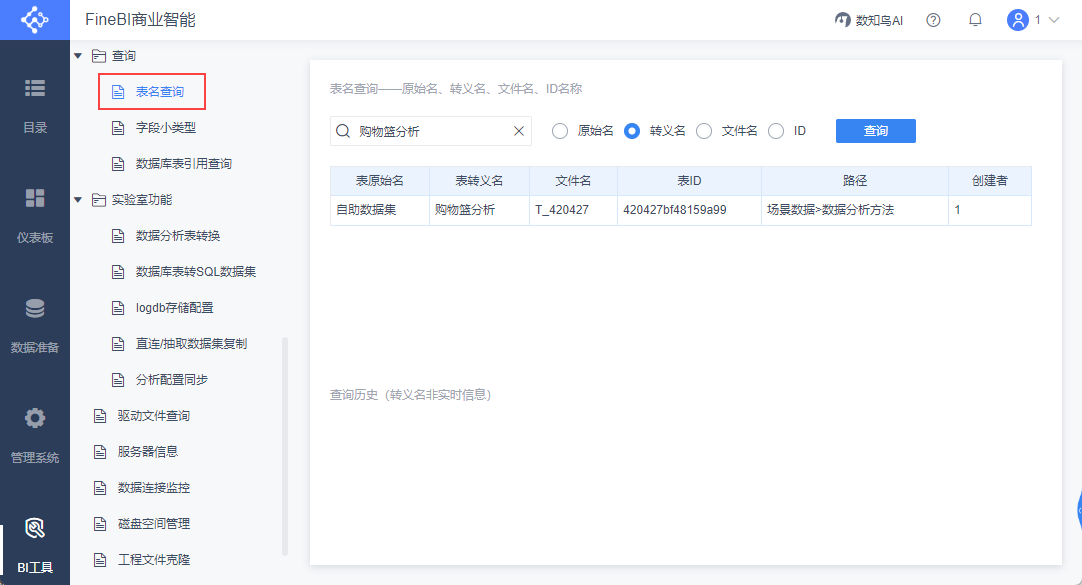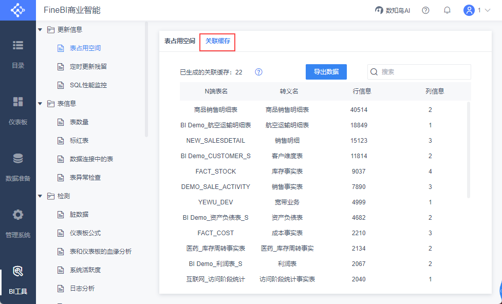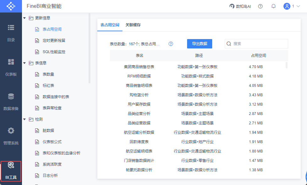显示FineBI系统下,表更新成功后,所占用的磁盘空间和表路径,支持导出明细数据。如下图所示: