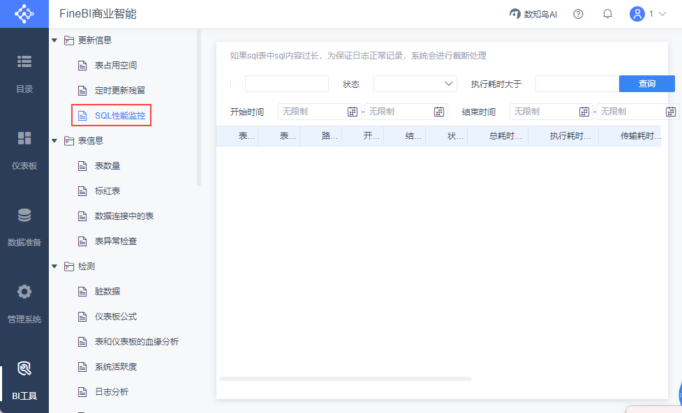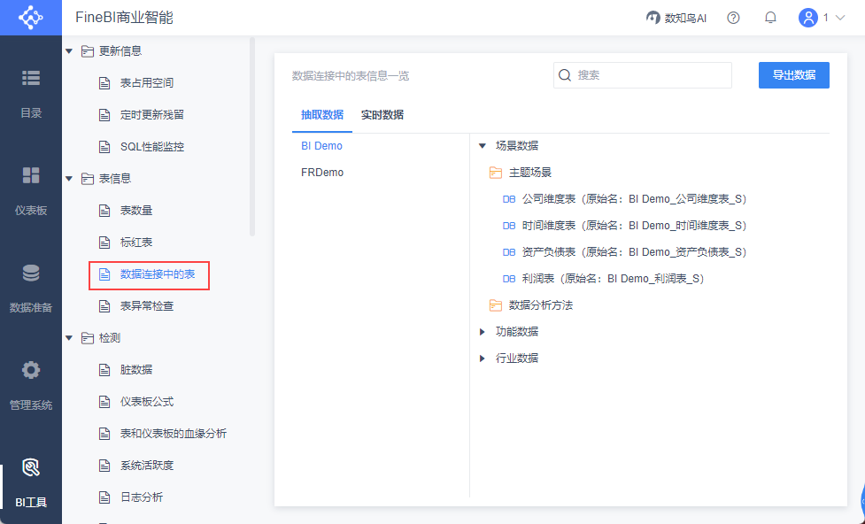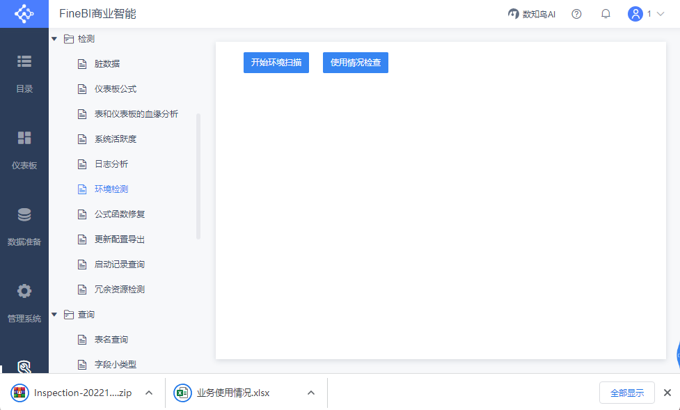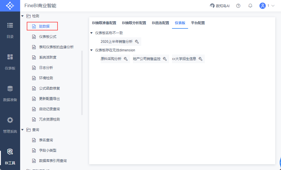 检查抽取数据、抽取自助数据集、直连数据、FineBI仪表板、FineBI系统平台配置中的脏数据。