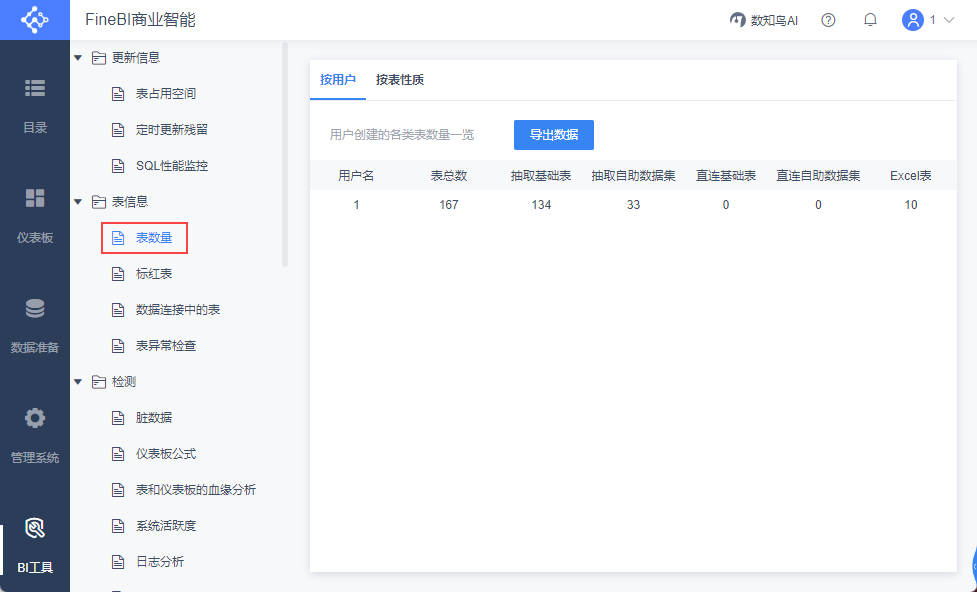 列举每个用户创建的各类(抽取、直连、基础表、自助分析)表数量,以及各类表数量分别汇总。