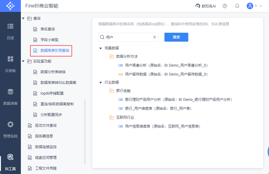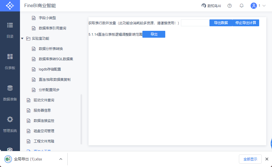 | 5.1.17 | 1)「数据库表转SQL数据集」新增支持抽数类型的db表转换为SQL表 2)「分析结果导出」功能分散到各个分析项中,不统一导出。分析项包括:表占用空间、更新失败表、无需抽取表、抽取表列表、关联缓存、按用户显示表数量、标红表、数据连接中的表、仪表板公式、按表性质显示表数量、公式函数修复。 3)新增「工程文件克隆」功能 |