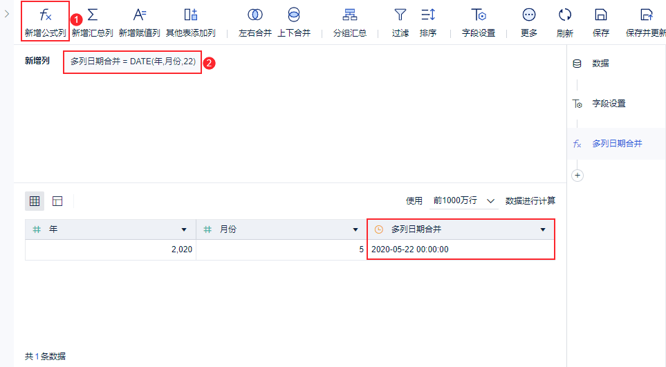 2)新增公式列「多列日期合并」,使用公式DATE(年,月份,22),如下图所示: