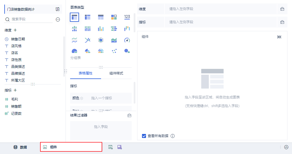 创建分析主题,上传 FineBI 自带的数据表「门店销售数据统计」,添加组件。如下图所示: