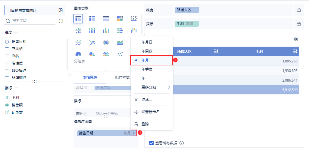 例如我们需要对内置数据「门店销售数据统计」表展示不同大区的毛利,但同时仅显示「月销售额大于 8,000,000 的月份」的数据。