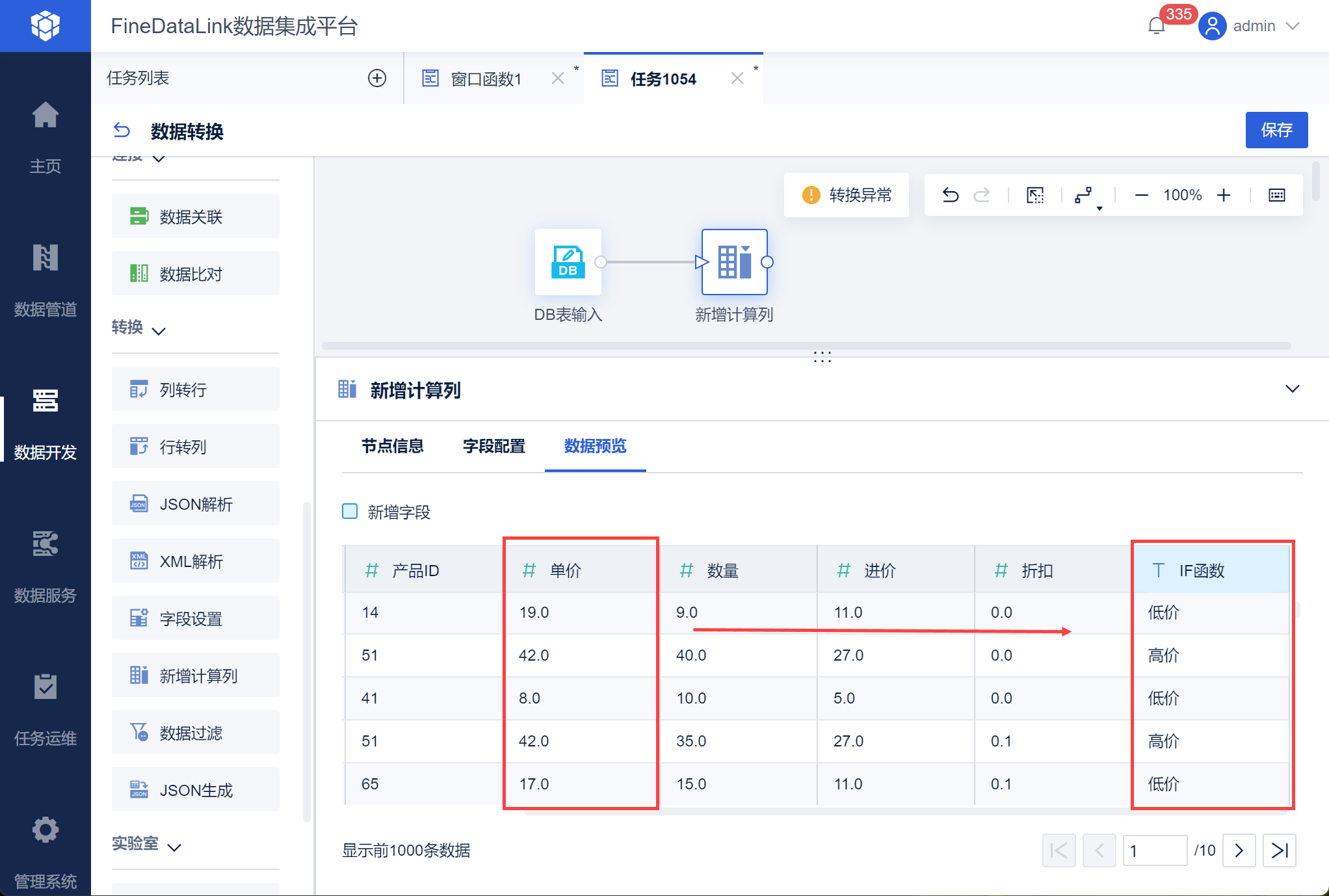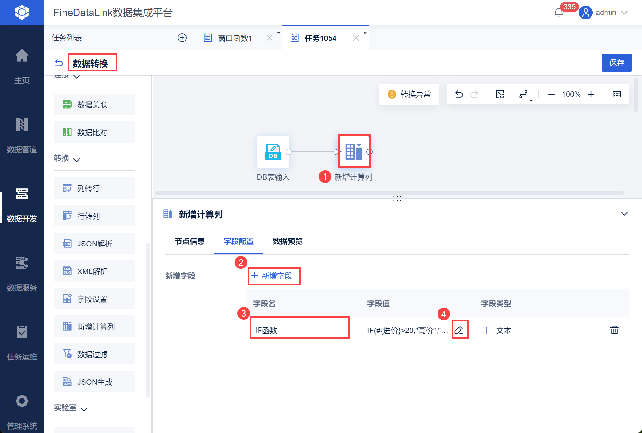 Add a Data Transformation node, drag in a DB Table Input operator, and use it to read data from the example table. Add a New Calculation Column operator, set the field name to IF_Function, and click Add Field Value to enter the formula editing page, as shown in the following figure.