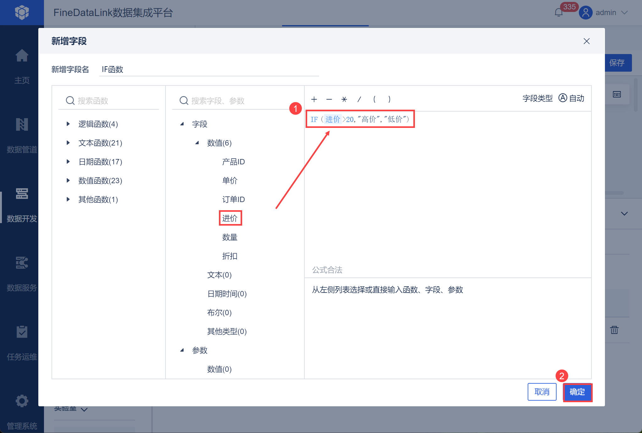 Input the formula IF(#{Cost_Price}>20,"High Price","Low Price"), as shown in the following figure. This evaluates products with a cost price exceeding 20 as "High Price", and others as "Low Price."