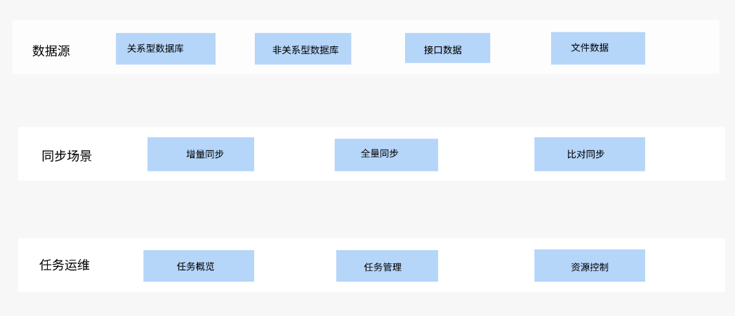 | 异构数据源之间的数据同步 | 目前支持关系型数据、非关系型数据库、接口数据、文件数据等20多种数据源之间的数据同步,通过定义「数据来源」和「数据去向」进行数据同步,详情参见:数据同步 |