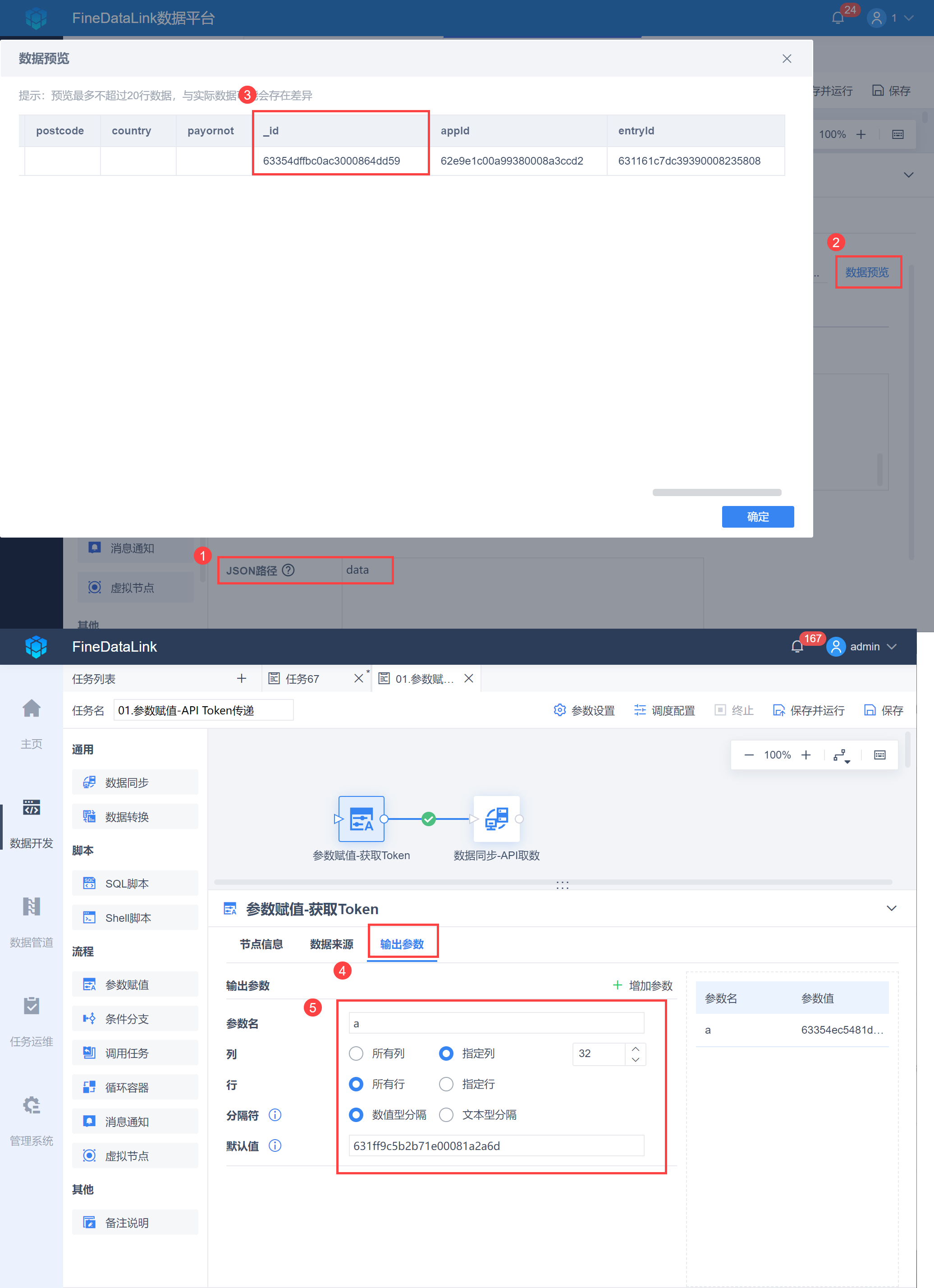 对于返回的 JSON 格式数据,可以通过填写 JSON 路径从返回结果中查询单个 JSON 对象或者数组,这里填写 data,点击「数据预览」即可查看到返回的响应数据,根据 1.2 节方案,需要将响应数据中的 ID 字段设置为参数,如下图所示: