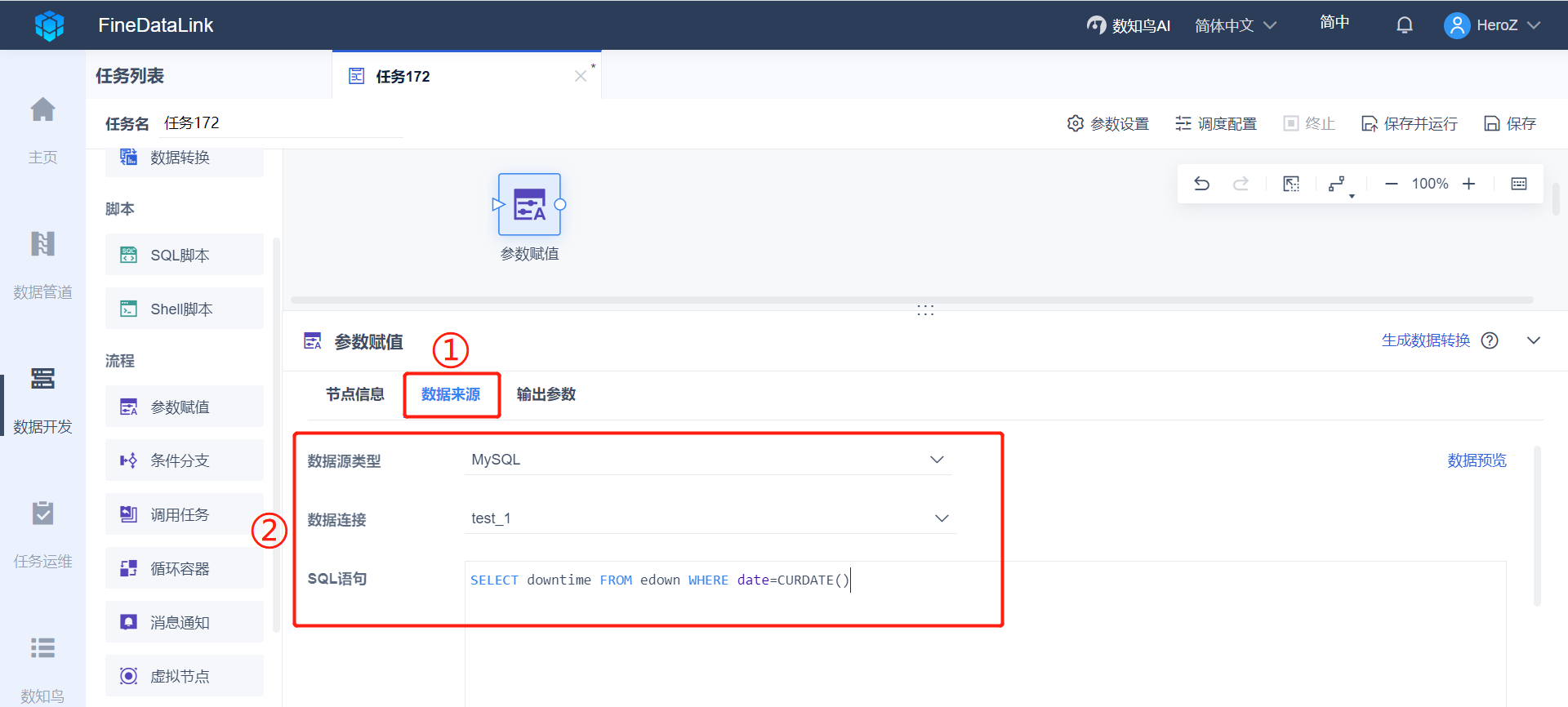 1)创建一个 ETL 任务,将一个参数赋值节点拖到设计界面,如下图设置数据来源,SQL 语句的作用是将当天机台宕机次数取出来,并输出为参数。