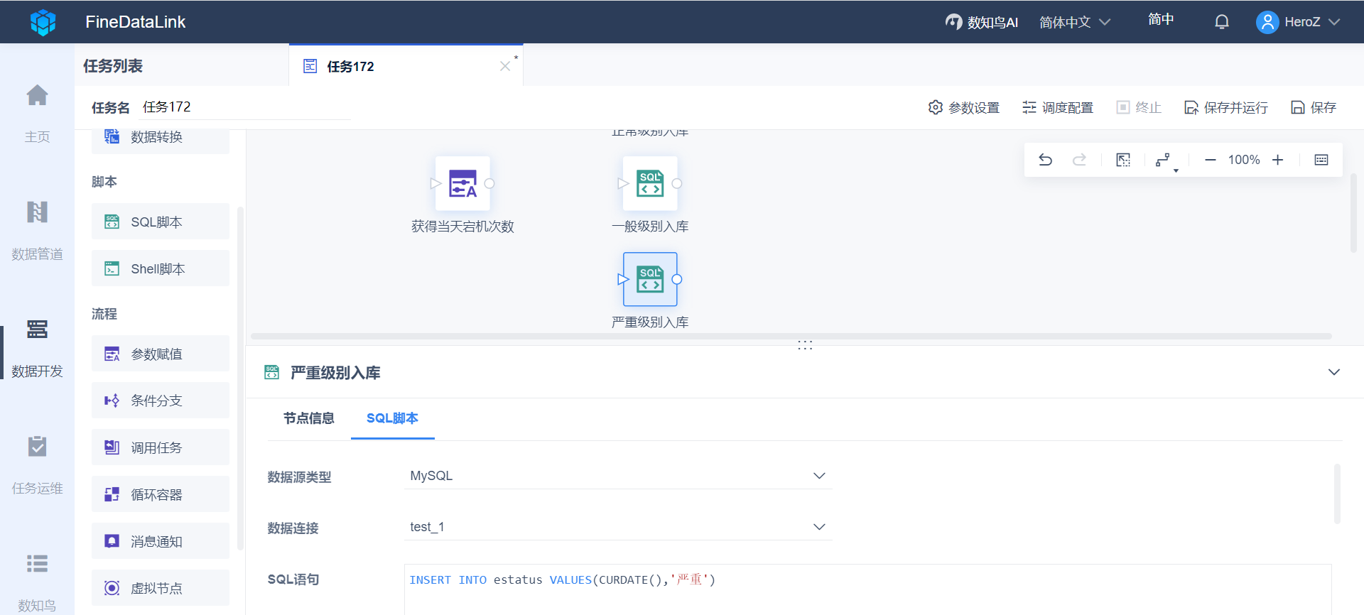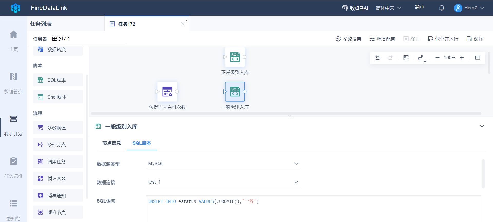 2)再将一个SQL脚本」节点拖到设计界面,如下图设置,SQL 语句的作用是:将当天日期和一般级别写到 estatus 表里,并将节点重命名为:一般级别入库。