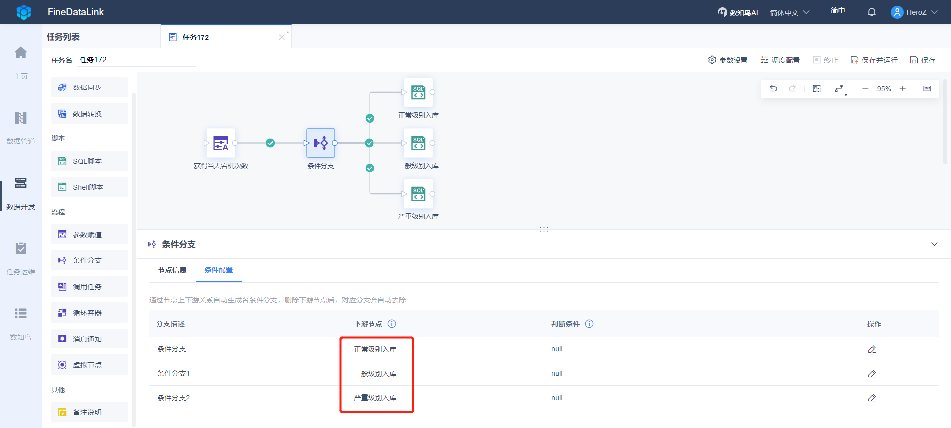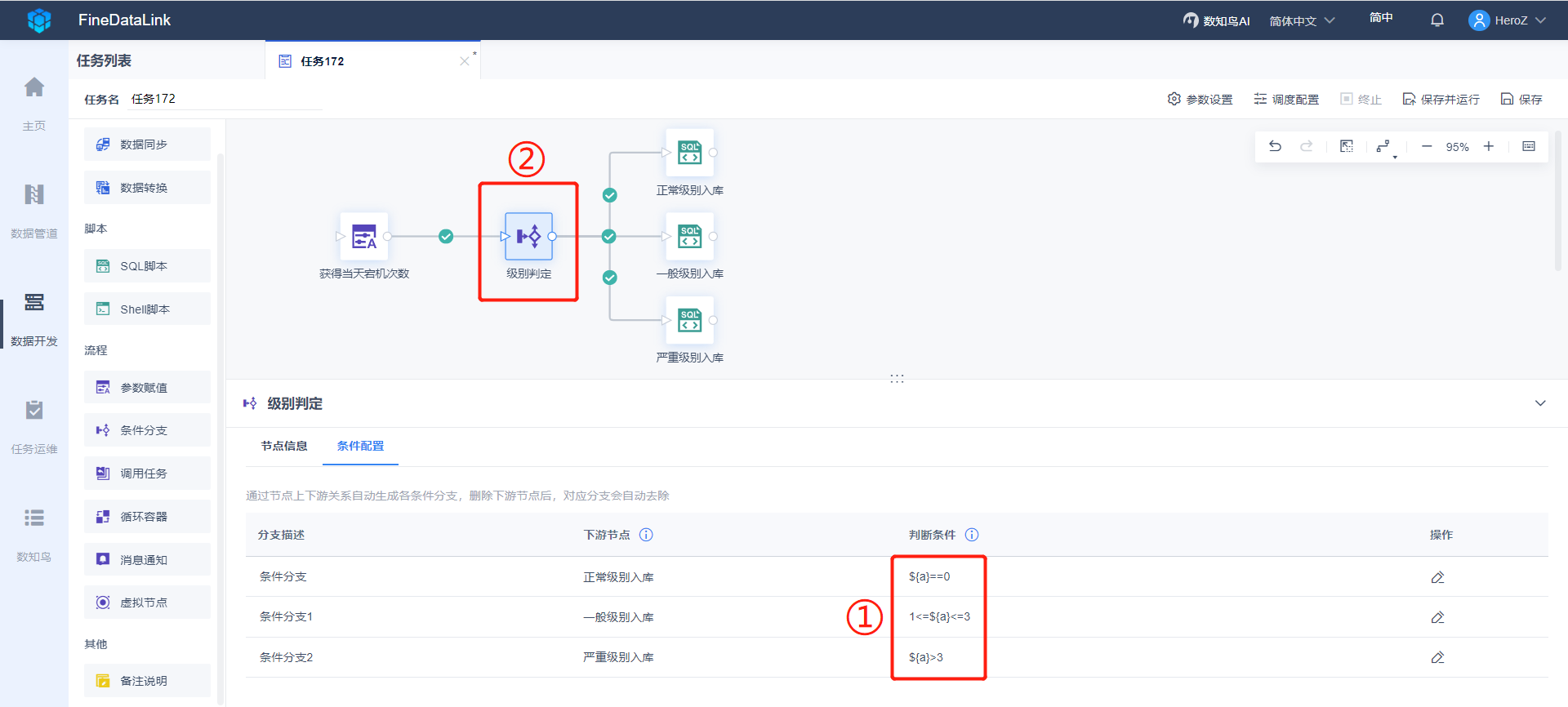 1)将一个条件分支」节点拖到设计界面,上游跟参数赋值节点连线,下游跟三个SQL脚本节点连线。