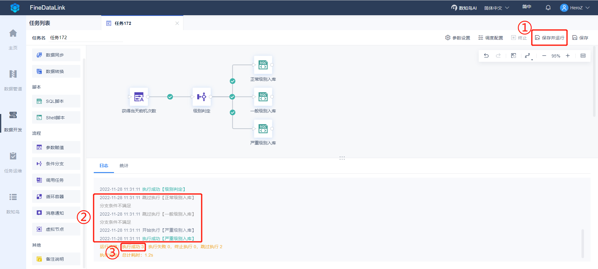当天的宕机次数是 6,保存并运行任务,日志处可以看到只执行严重级别入库,其他两个入库节点直接跳过了。