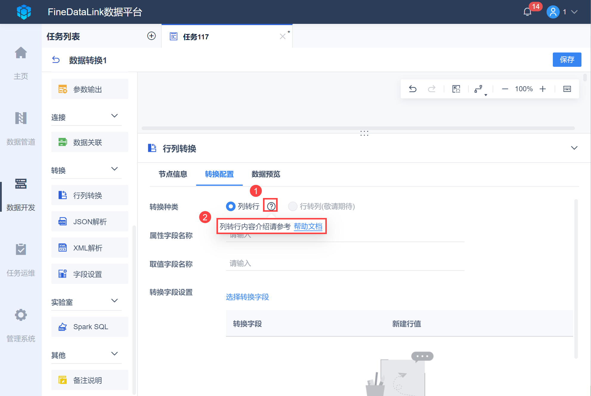 同时,对行转列算子提示,用户可直接查看帮助文档进行学习,如下图所示: