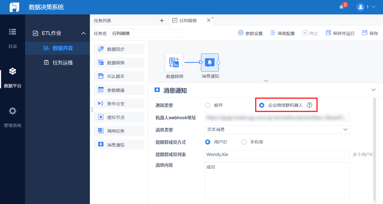 「消息通知」,可将任务调度结果以企业微信群机器人/邮件的形式通知给指定用户。