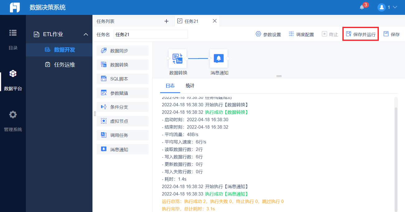 将「数据转换」节点和「消息通知」节点连接起来。如下图所示: