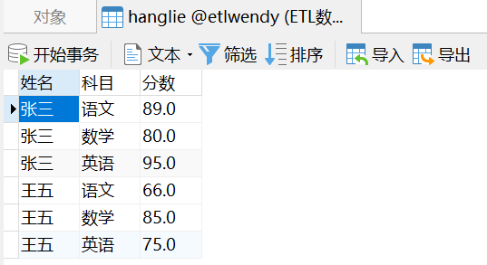 可以看到数据库 etlwendy 中新增了一张表 hanglie,为列转行后数据。如下图所示: