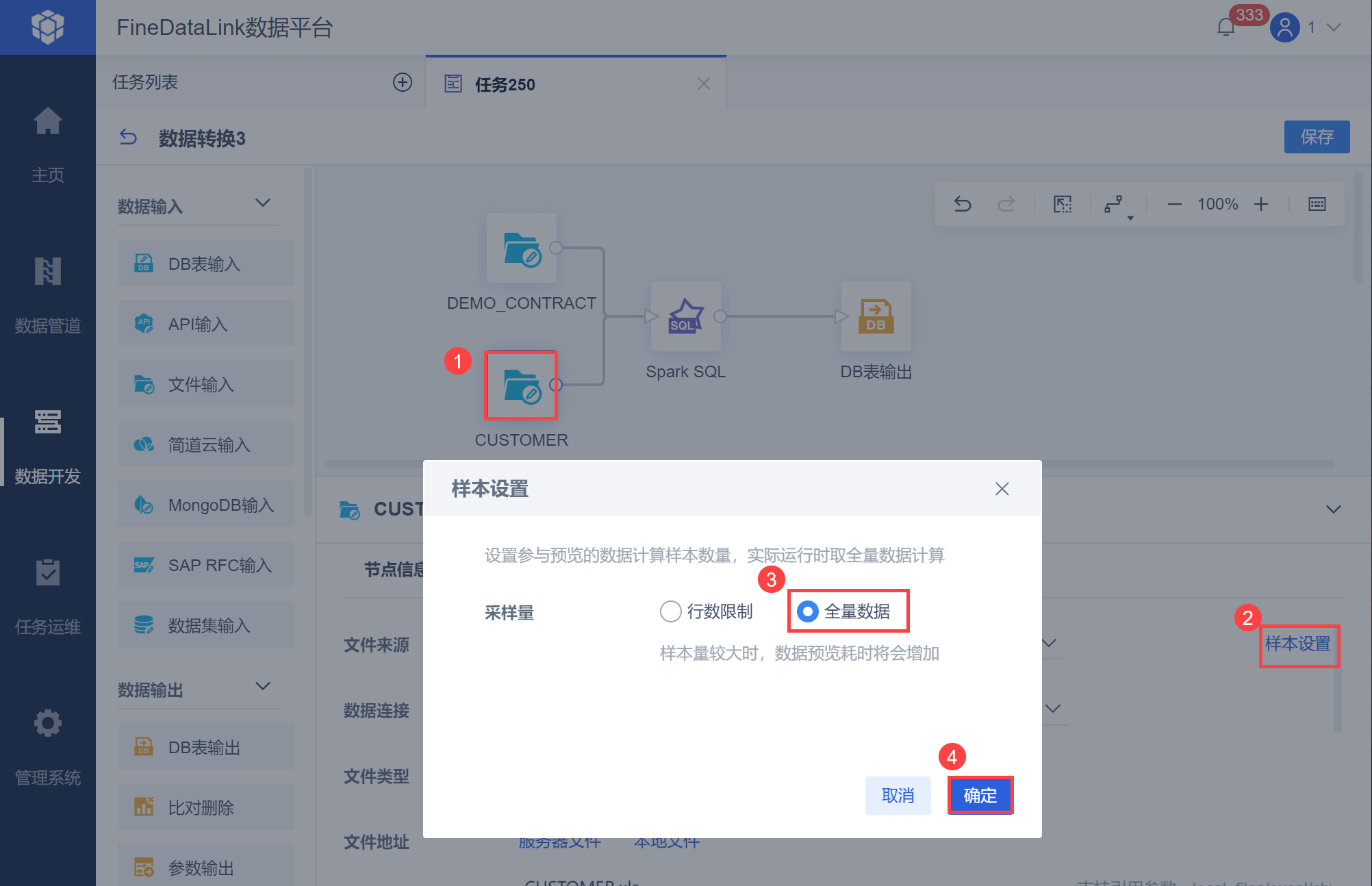 FineDataLink 支持在「数据转换」的输入型算子中进行「样本设置」,即在预览界面,设置用多少数据去参与运算,便于进行计算后的预览结果校验。
