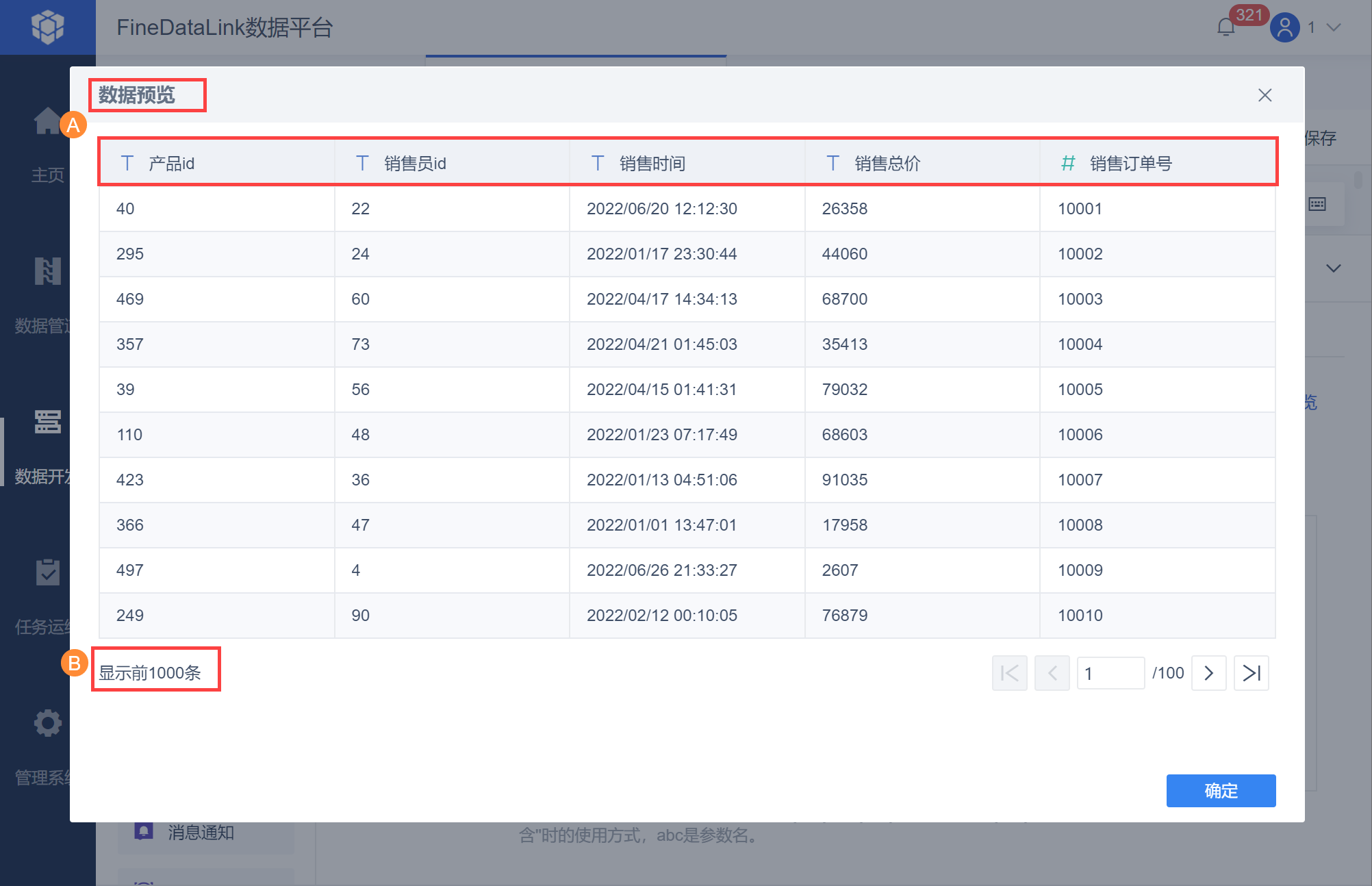 FineDataLink 「数据同步」、「参数赋值」、「数据转换」支持预览数据量默认显示 1000 行,同时支持显示字段数据类型,便于用户进行数据处理和计算。