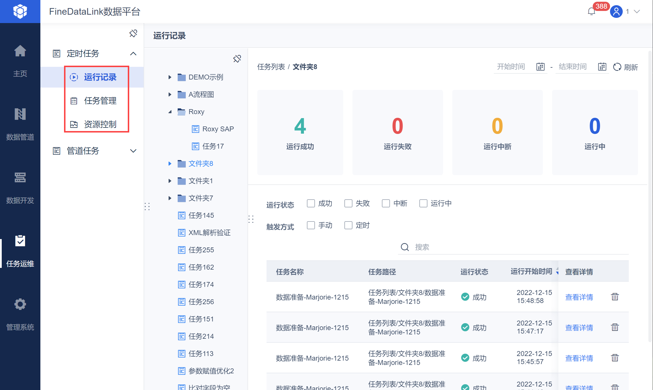 FineDataLink 支持通过筛选和搜索的方式查看任务运行耗时以及任务运行的历史日志;同时对任务管理界面进行了视觉优化,让用户更好的进行任务管理。