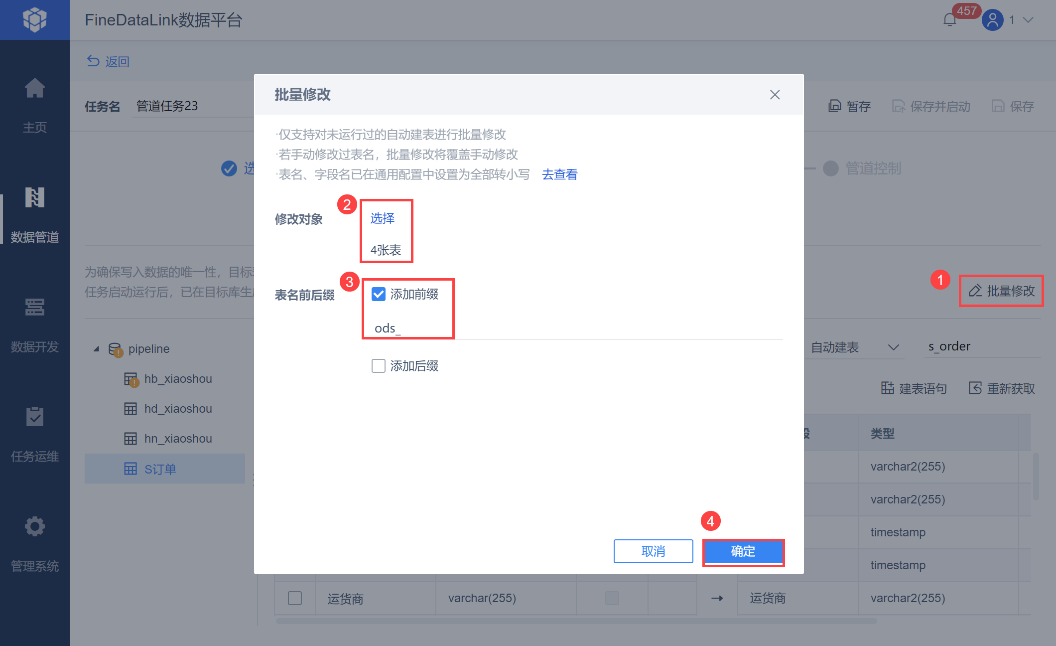 支持批量编辑目标数据库表名前后缀,可以给同步的数据表批量增加前缀或者后缀,如下图所示: