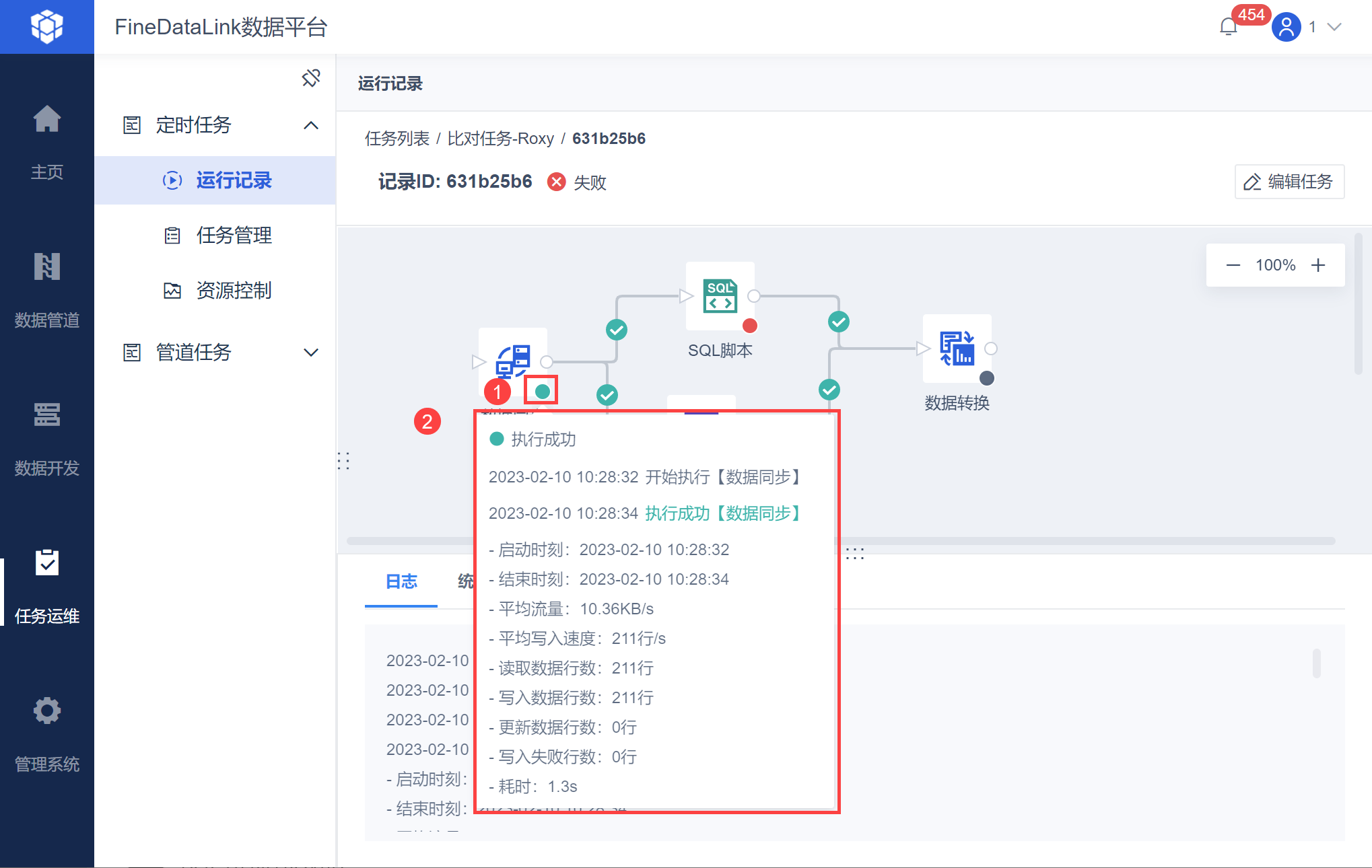 若设计任务时节点有异常,则会提示共有几个任务节点异常,同时鼠标悬浮在对应节点的异常警示图标时,出现悬浮框提示具体的异常问题,如下图所示: