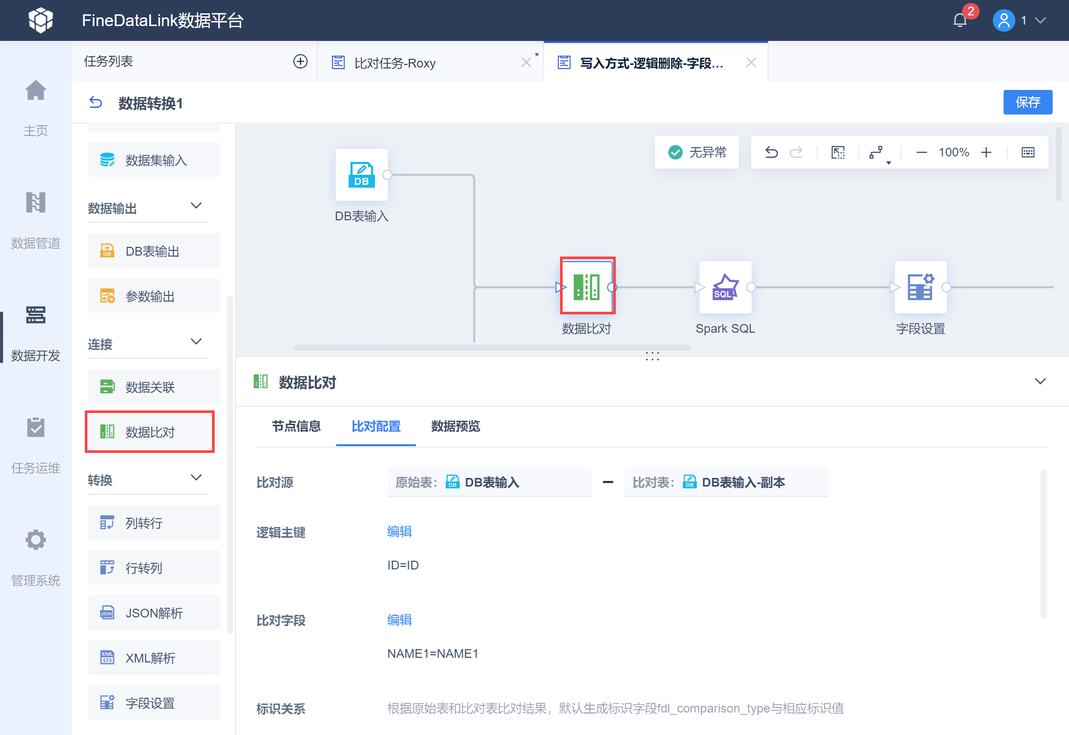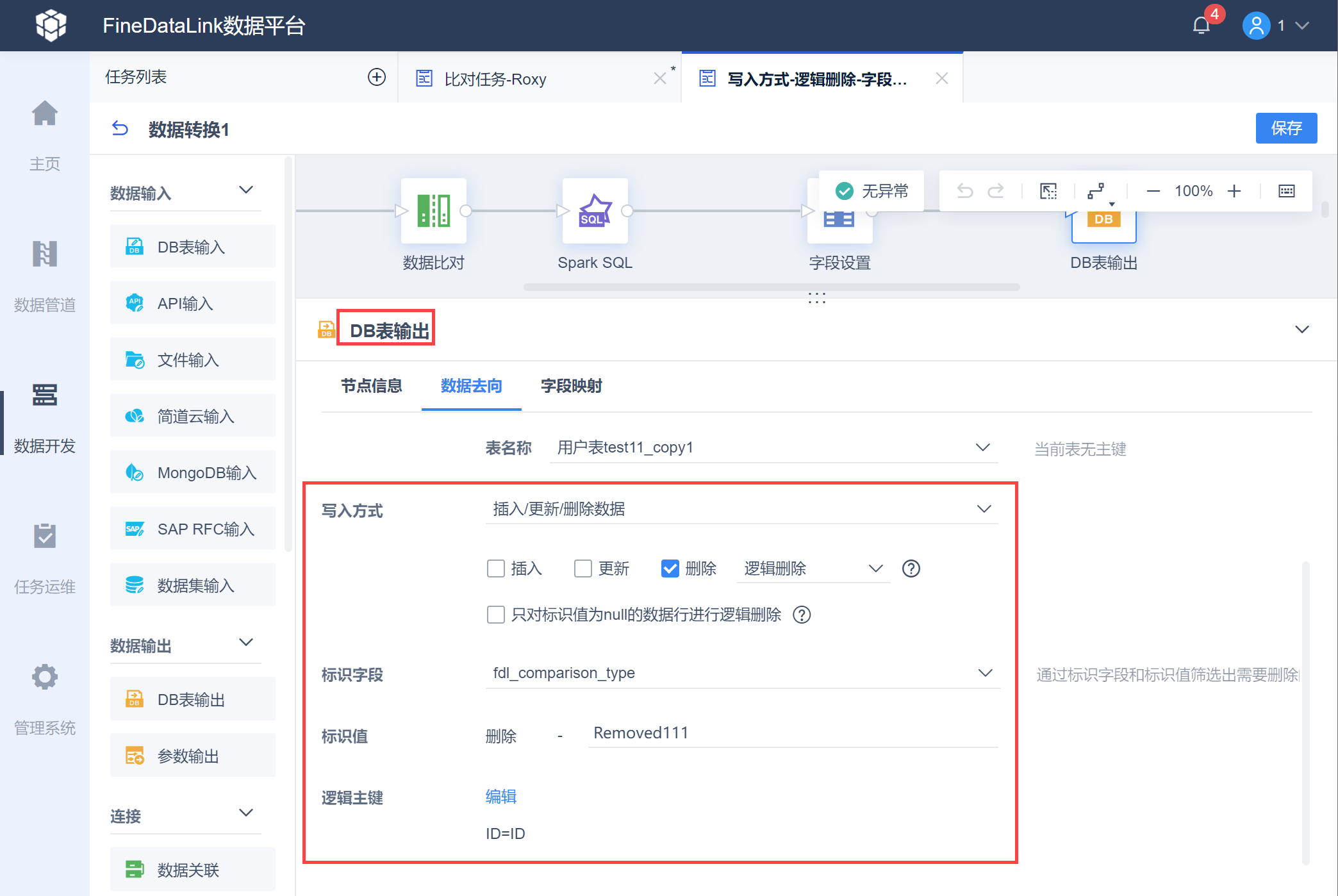 通过数据比对+DB表输出(写入方式选择插入/更新/删除数据)的组合方式,用户自定义的比对范围,来完成更灵活的增量插入/更新/删除的功能。