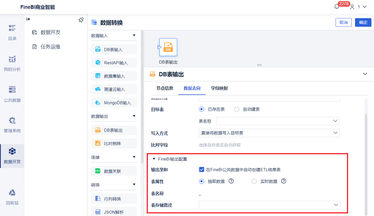 在 ETL 任务的输出端勾选「在FineBI公共数据中自动创建ETL结果表」,并完成相应的输出配置,任务运行时将自动在FineBI 中创建一张与 ETL 任务的输出表同名的 ETL 结果表。如下图所示: