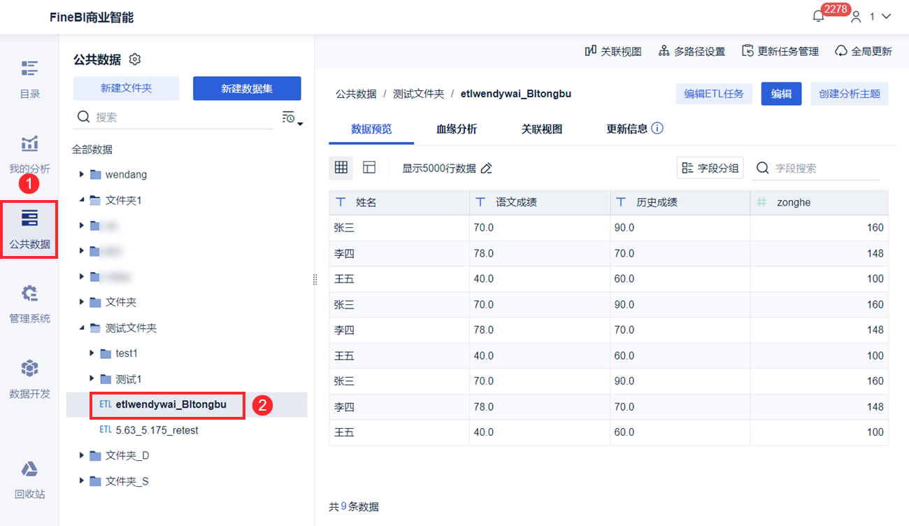 点击「公共数据」,在「测试文件夹」中可以看到etlwendywai_BItongbu表。如下图所示: