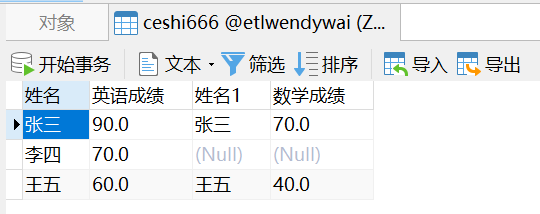 本文演示一个简单示例:将两个不同数据库中的成绩表关联成一张新表。