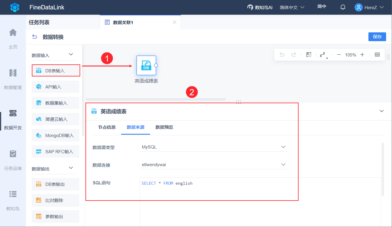 1)将一个「DB输入」算子拖到数据转换的设计界面,如下图设置数据来源,并右键节点将其重命名为「英语成绩表」。如下图所示: