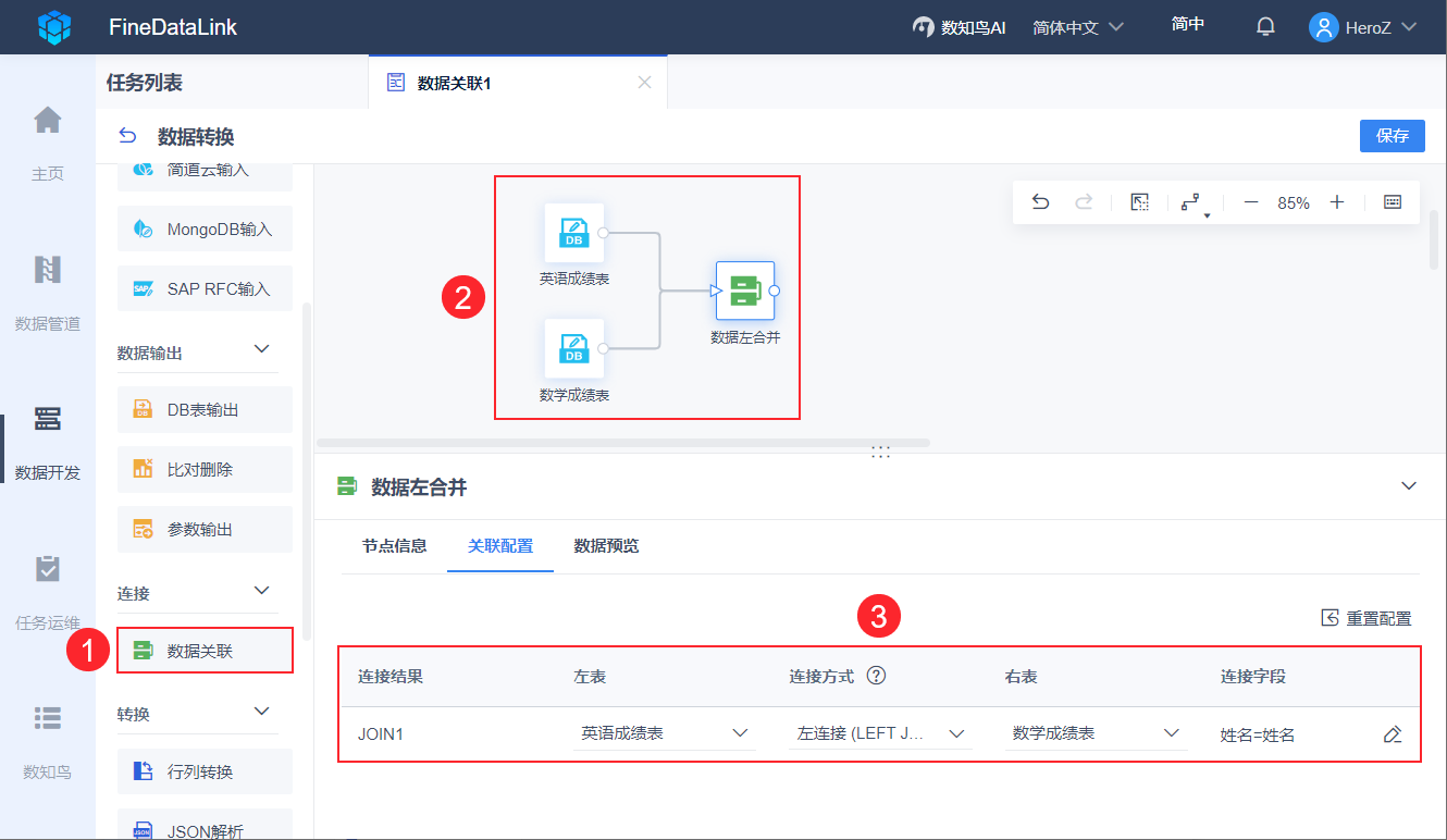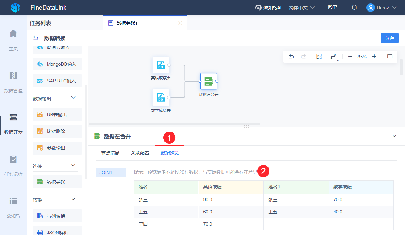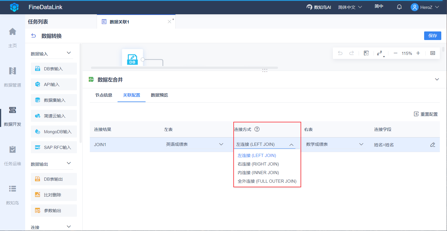 点击「数据关联」节点,左表设置为「英语成绩表」,右表设置为「数学成绩表」,连接方式选择「左连接」,连接字段设置为「姓名」,右键节点重命名为「数据左合并」。如下图所示: