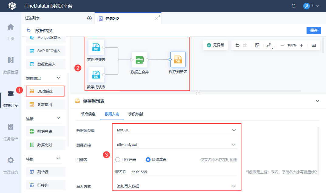 将一个「DB表输出」算子拖到数据转换的设计界面,用线条跟上游节点「数据左合并」连起来,右键节点重命名为「保存到新表」。如下图所示: