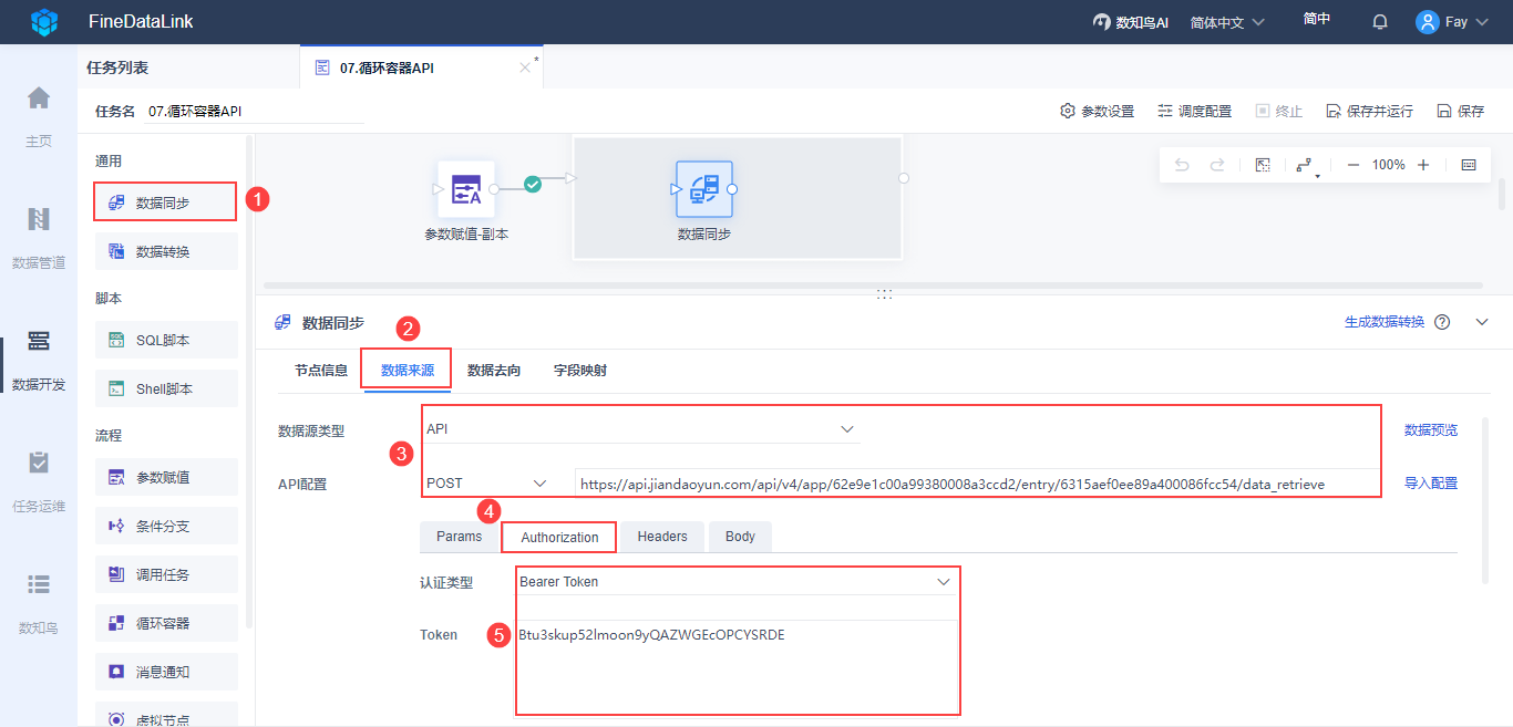 为了将 API 接口中的数据取出,需要将「数据同步」节点拖入到「循环容器」中,并输入 API、请求方式、认证类型,API 取数详情参见:数据同步-API,如下图所示: