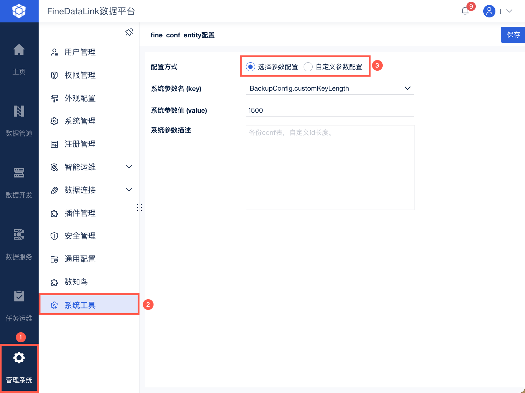 插件安装成功后,超级管理员登录 FineDataLink 数据平台,点击「管理系统」,新增「系统工具」设置。如下图所示: