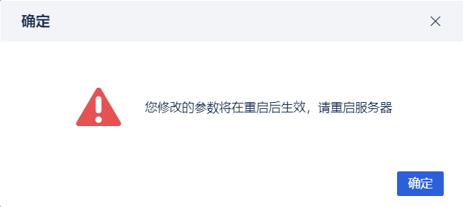 按照参数规则修改配置后,点击「保存」,跳出提示框:您修改的参数在重启后生效,请重启服务器。
