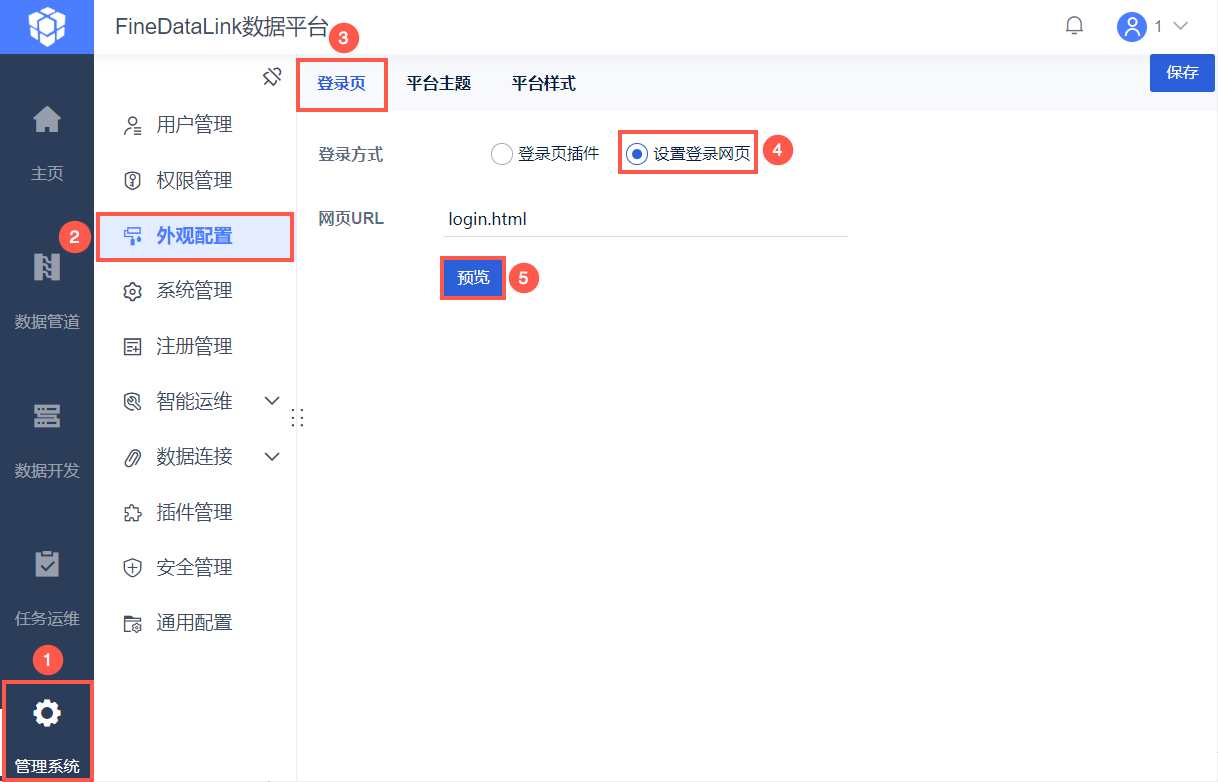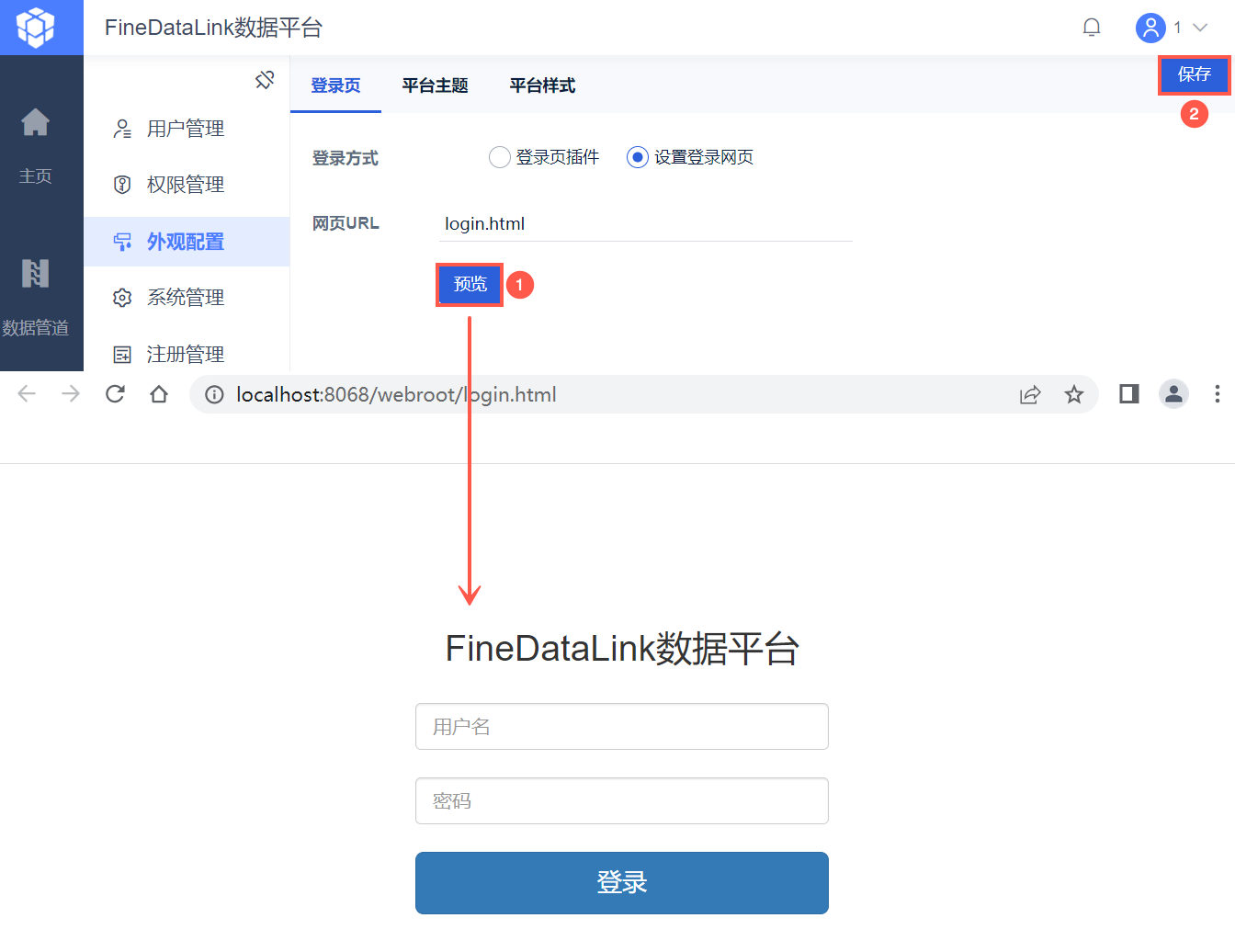 管理员登录 FineDataLink ,点击「管理系统>外观配置>登录页」,选择登录方式为「设置登录网页」,并输入自定义登录页面的路径:「login.html」,如下图所示: