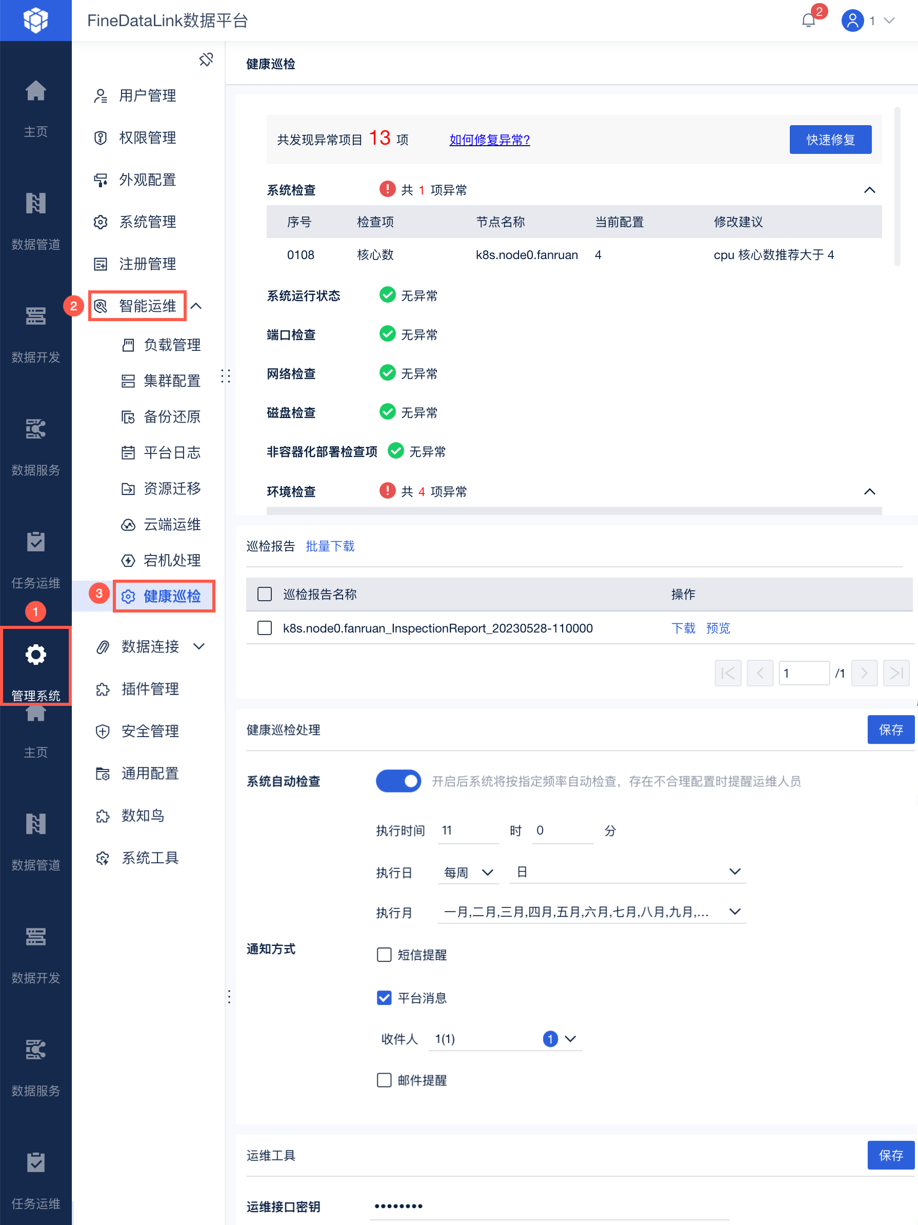 建议管理员使用「健康巡检」功能,对系统进行定期巡检,确保应用所在的环境及应用内配置合理,以保证应用的正常运行。