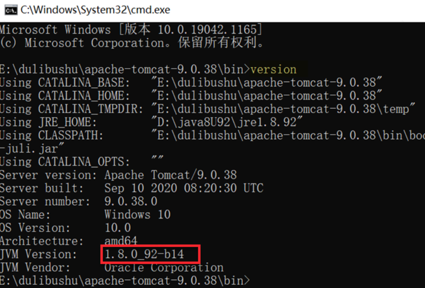 cmd 命令行进入%Tomcat_home%\bin路径下,输入version,即可查看 JDK 版本。如下图所示: