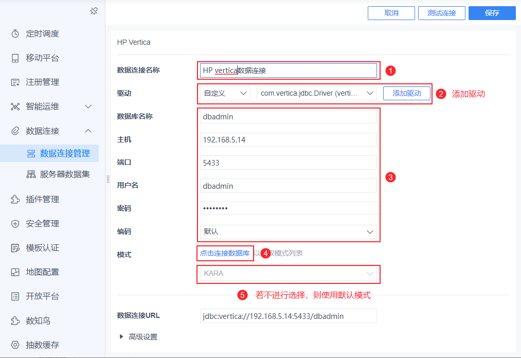 3)驱动切换为「自定义」选择 2.1 节上传的驱动,并输入 2.2 节收集的连接信息。