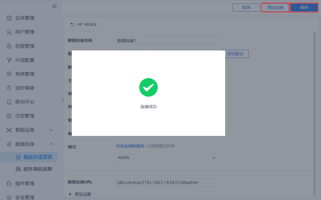 4)点击「测试连接」,若连接成功则点击「保存」,如下图所示: