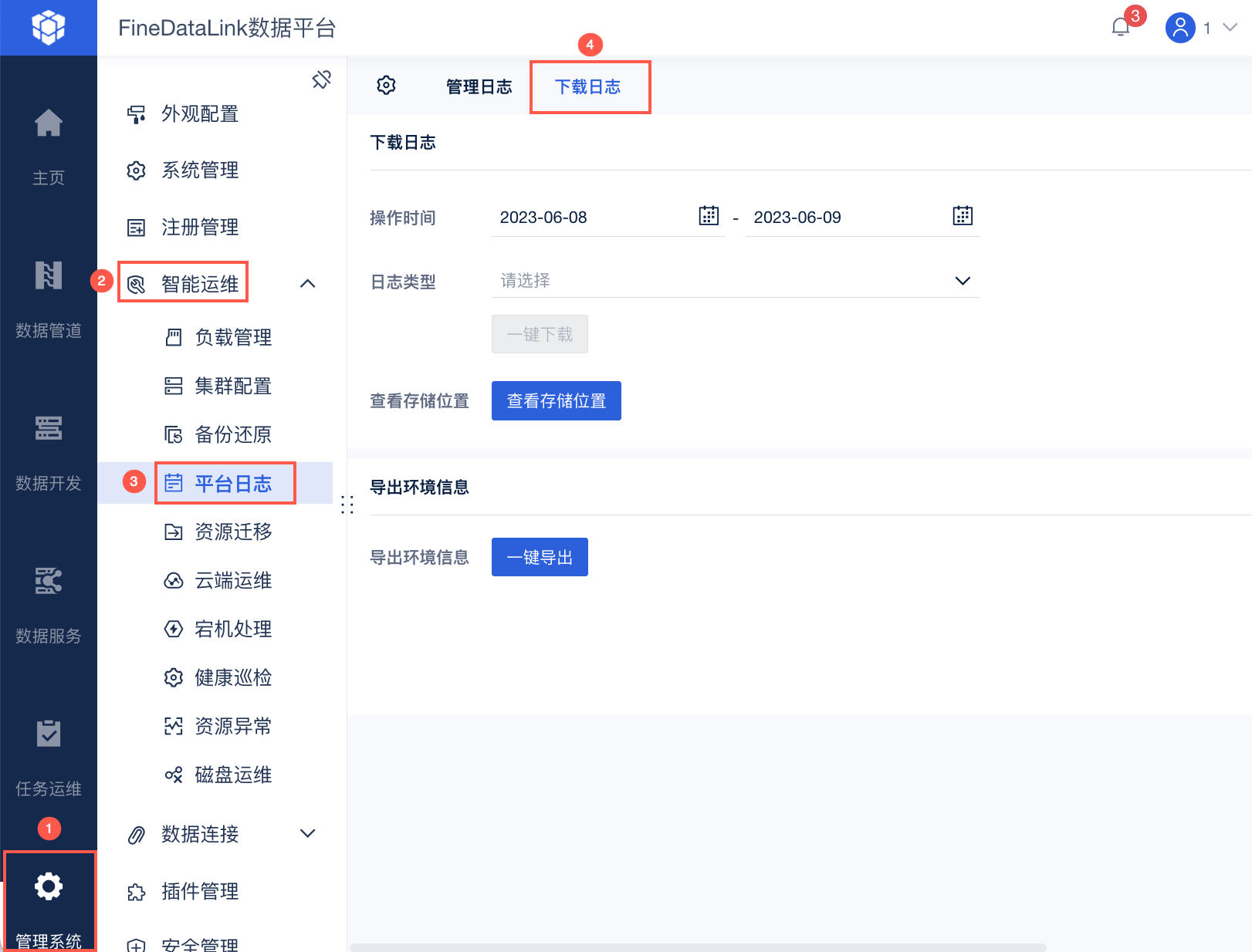 帆软提供下载日志功能,管理员登录 FineDataLink ,点击「管理系统>智能运维>平台日志」,其中「下载日志」Tab 提供相应功能。