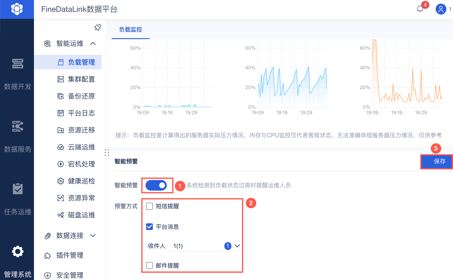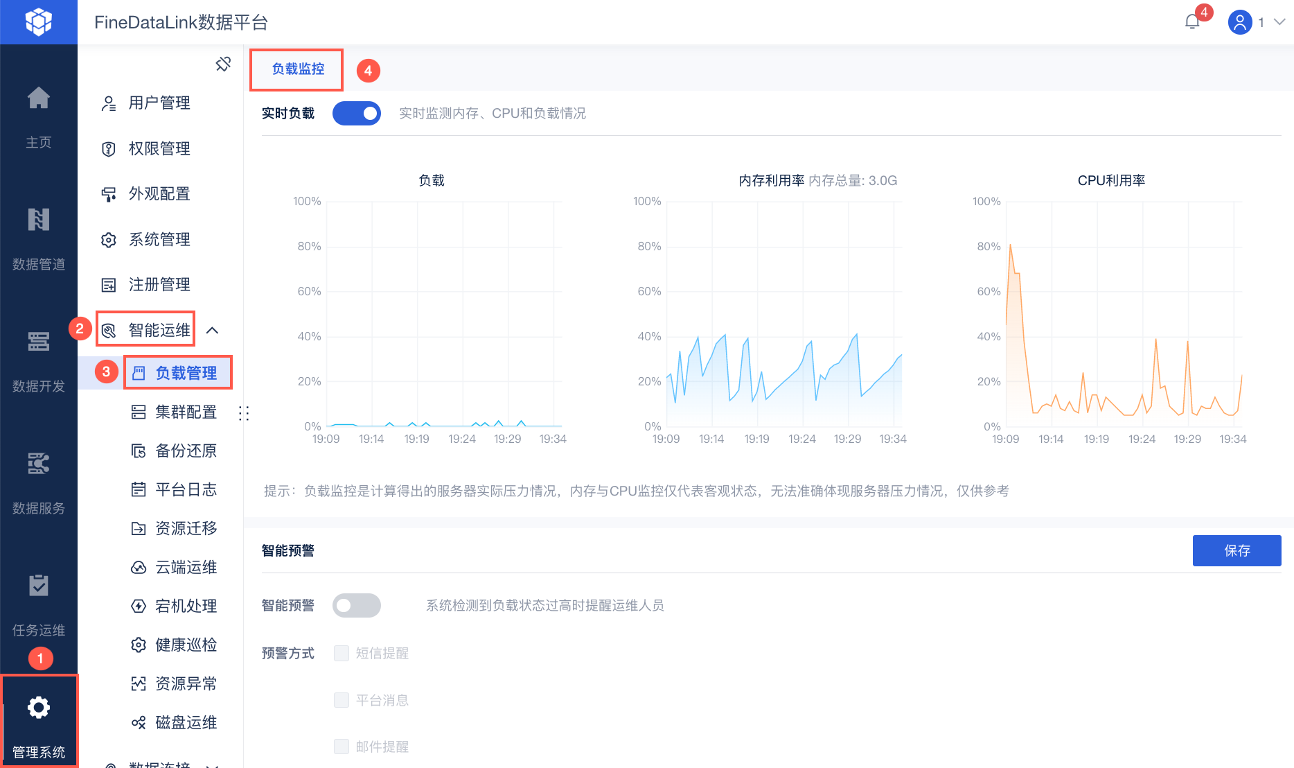 管理员登录 FineDataLink ,点击「管理系统>智能运维>负载管理」,其中「负载监控」内可进行智能预警配置。