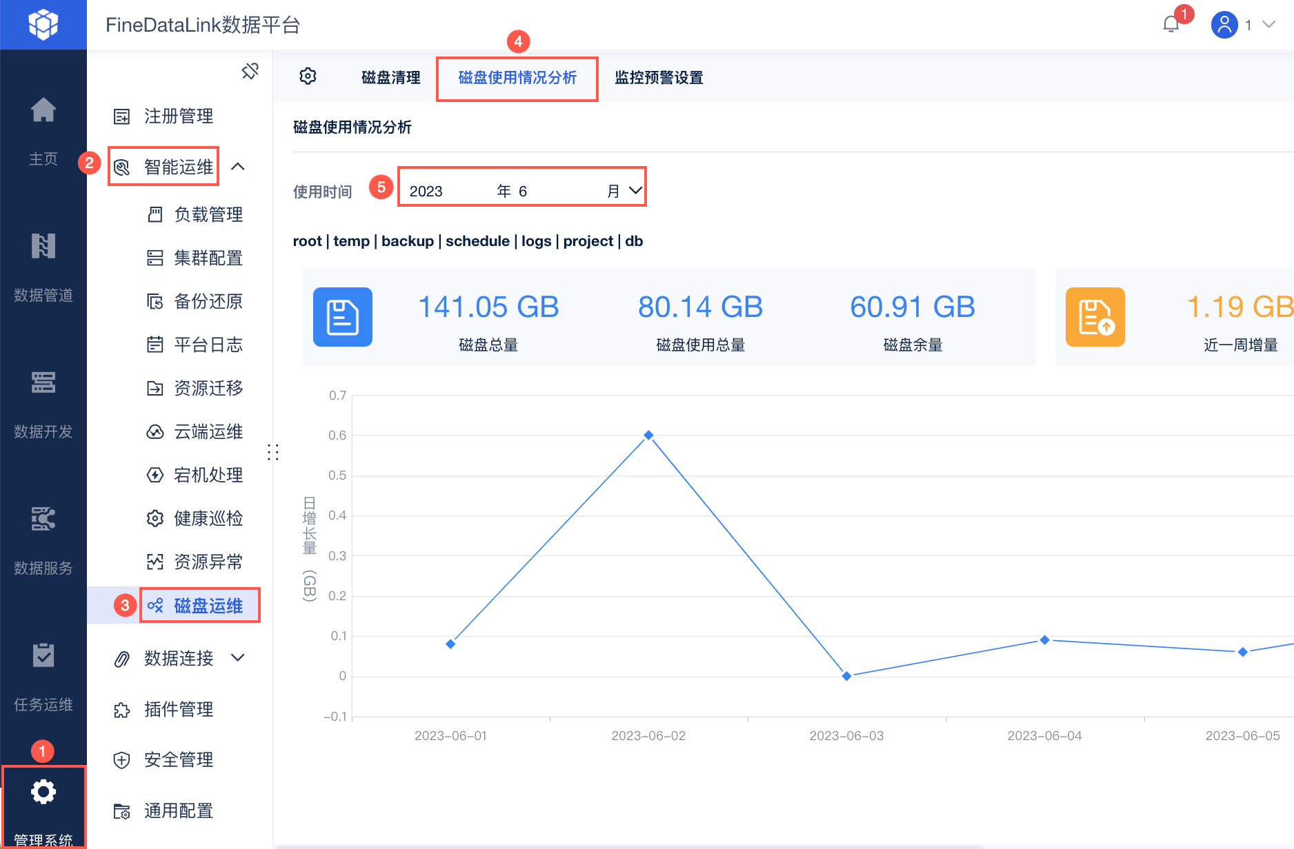 帆软提供磁盘运维功能,点击「管理系统>智能运维>磁盘运维」,其中「磁盘使用情况分析」Tab提供相应功能。