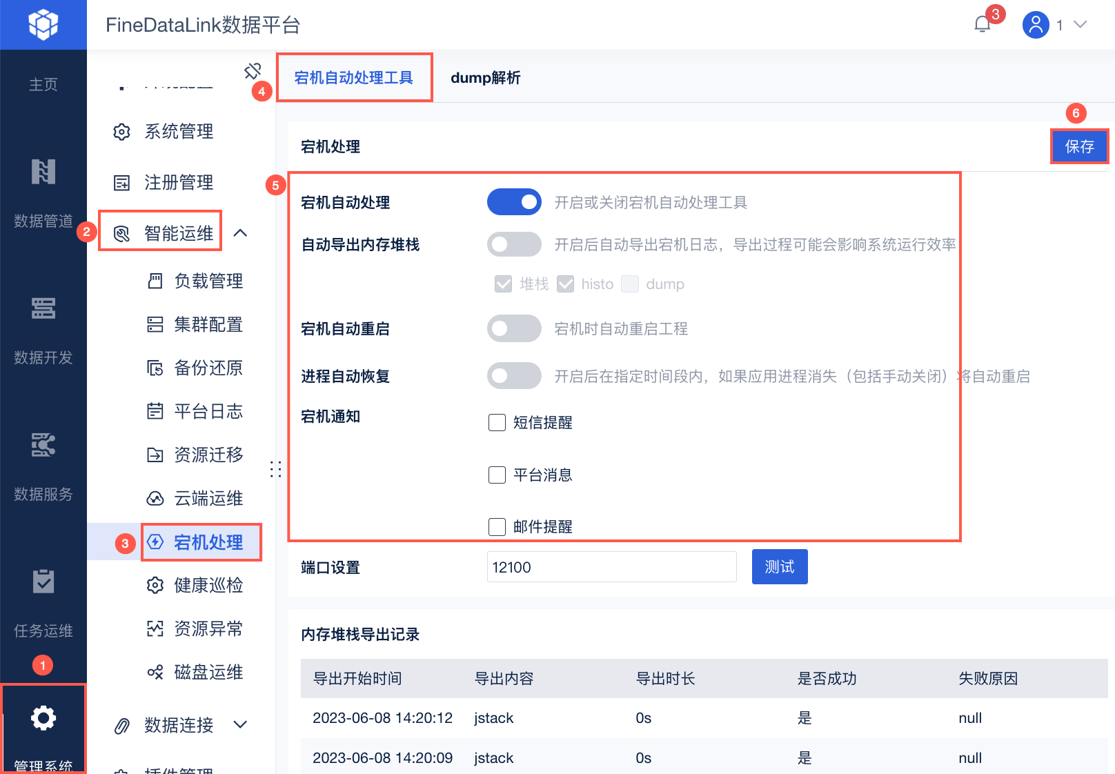5)针对宕机定位,帆软提供宕机自助处理功能,管理员登录 FineDataLink ,点击「管理系统>智能运维>宕机处理」。