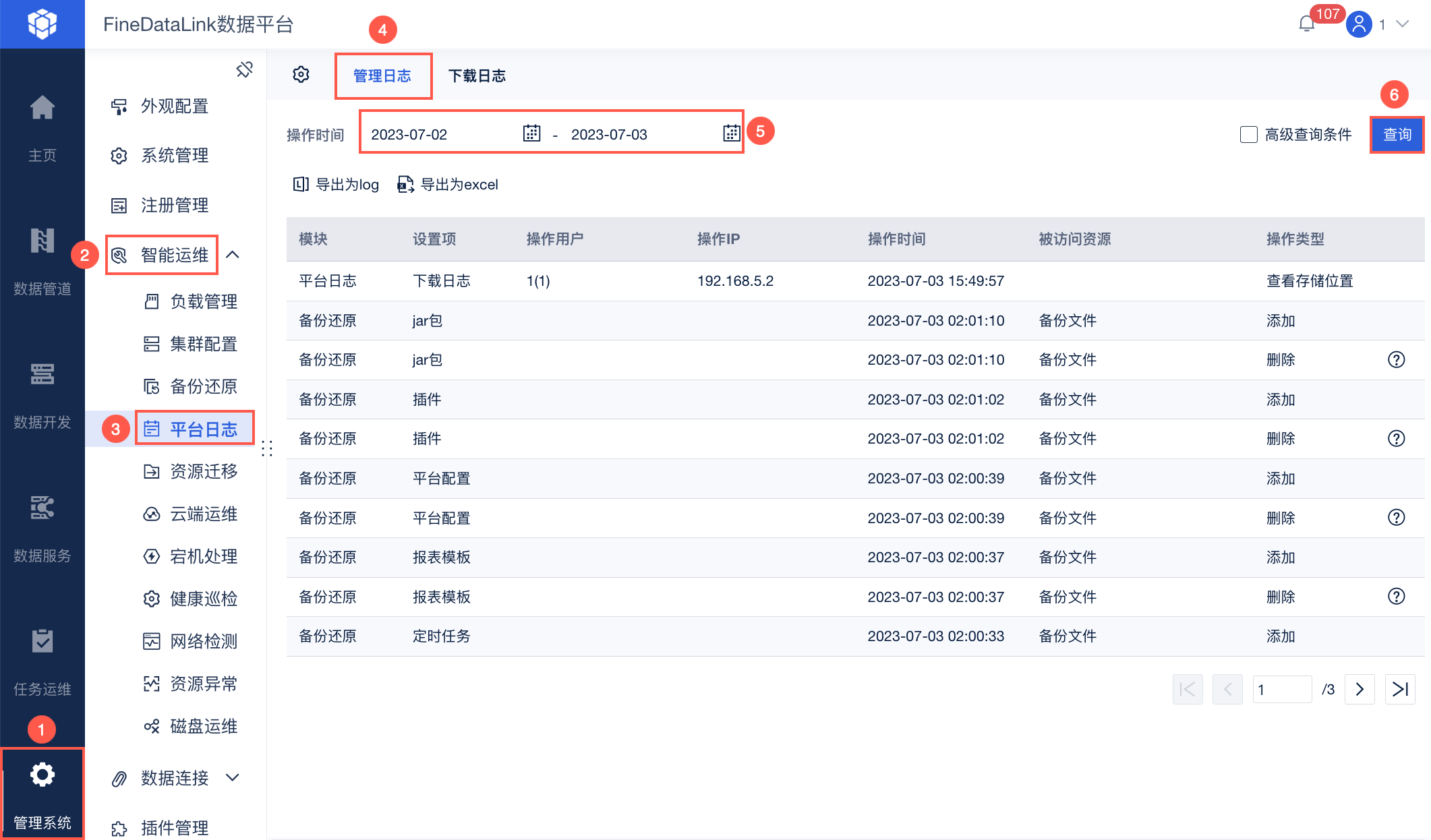 管理员登录 FineDataLink 后,进入「管理系统>平台日志>管理日志」,可选择管理日志的操作时间范围,支持「年月日」和「动态时间」。