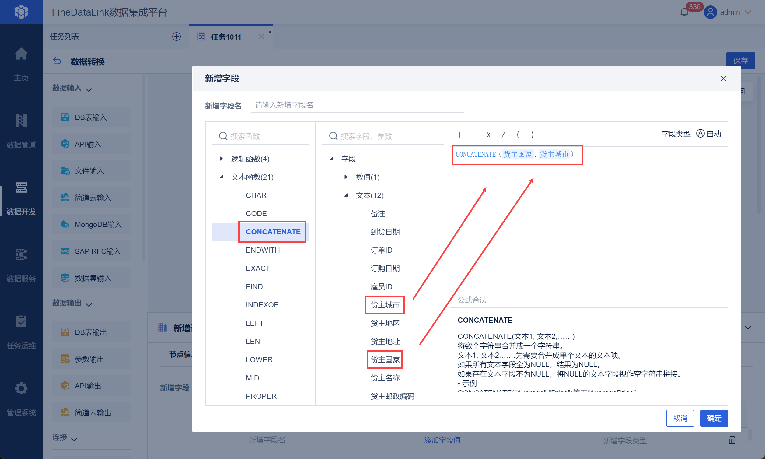 例如:如果要将「货主国家」和「货主城市」两字段进行合并,输入公式:CONCATENATE(货主国家,货主城市),在左侧的字段选择区域点击选择需要的字段,如下图所示: