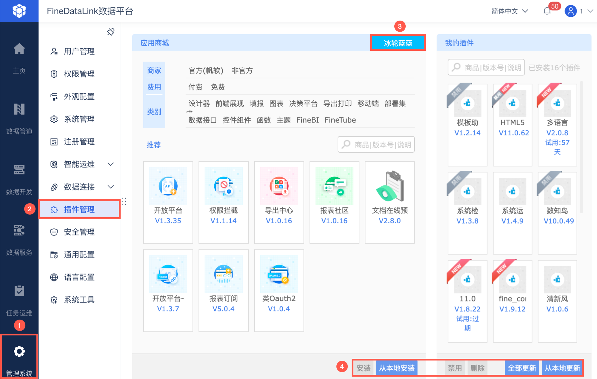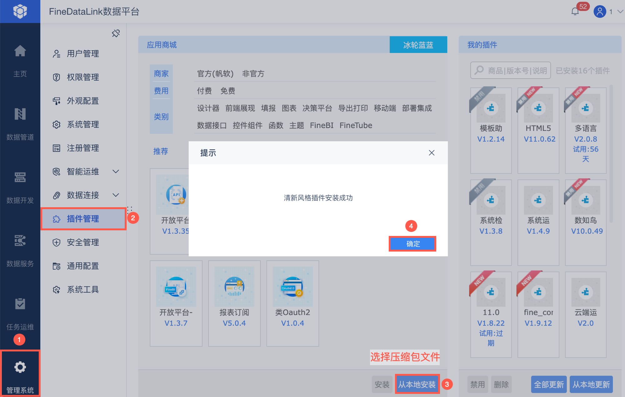 2)管理员登录 FineDataLink 数据平台,点击「管理系统>插件管理>从本地安装」,选择.zip压缩包,如下图所示: