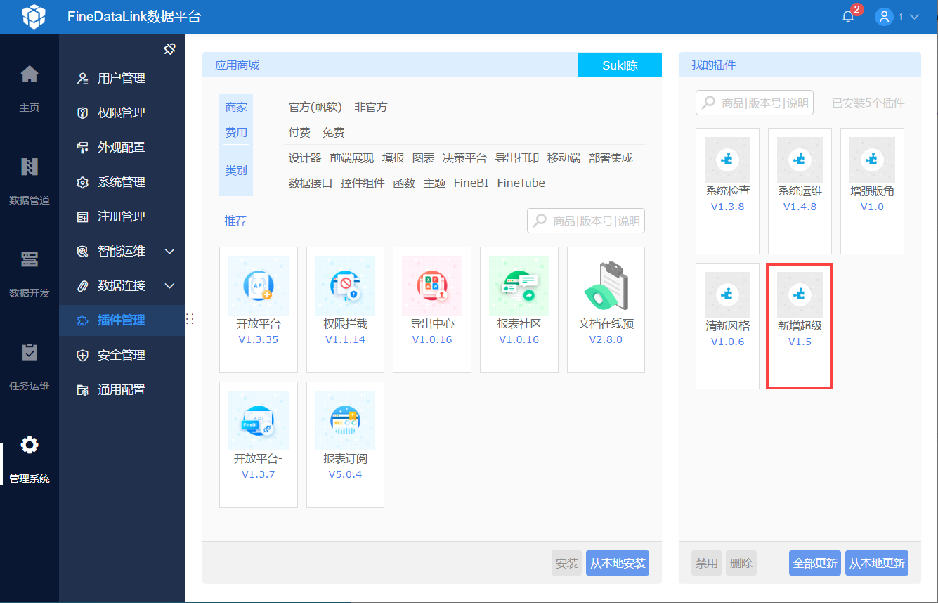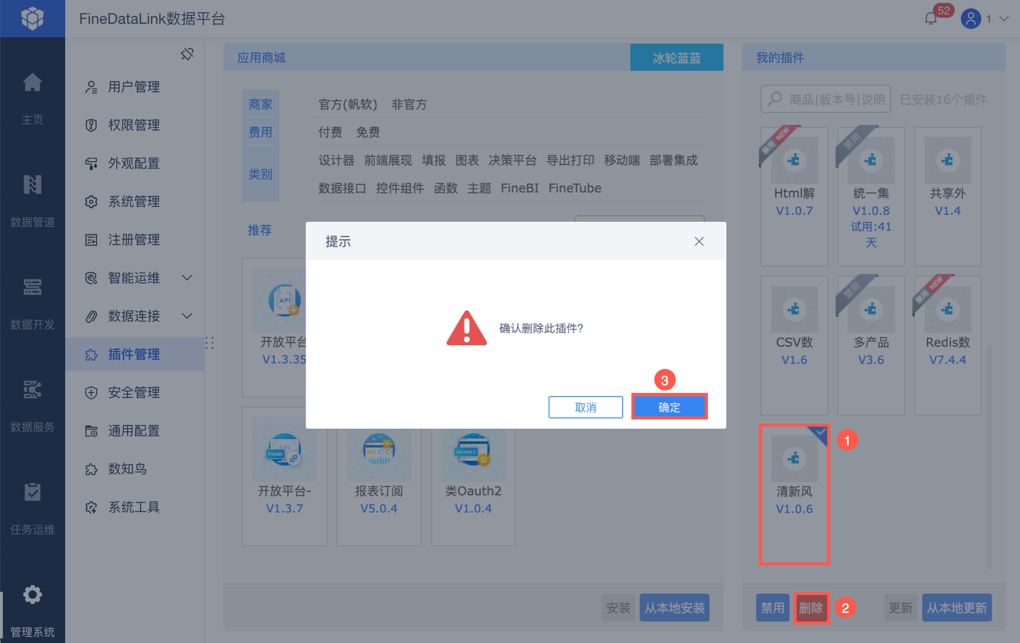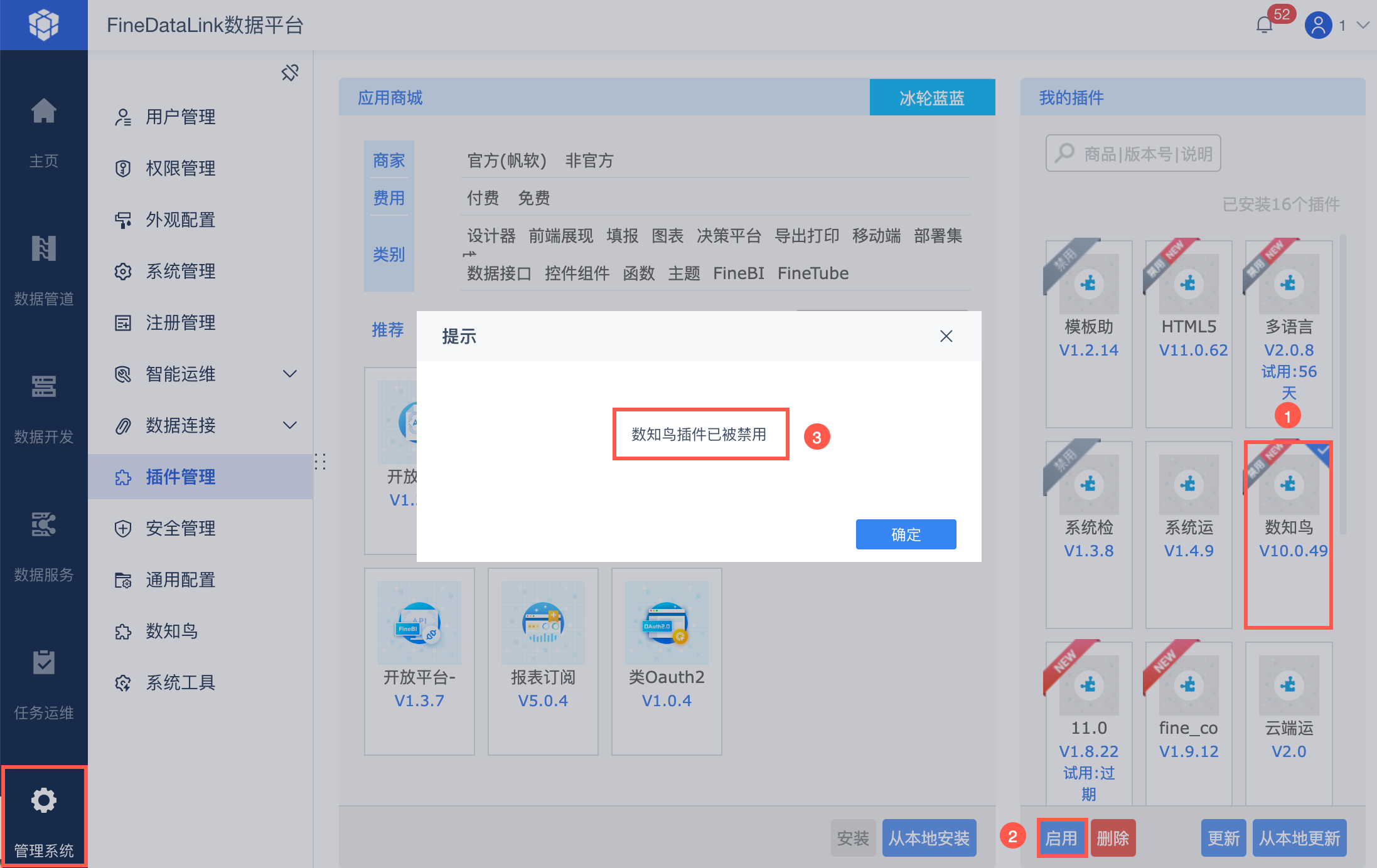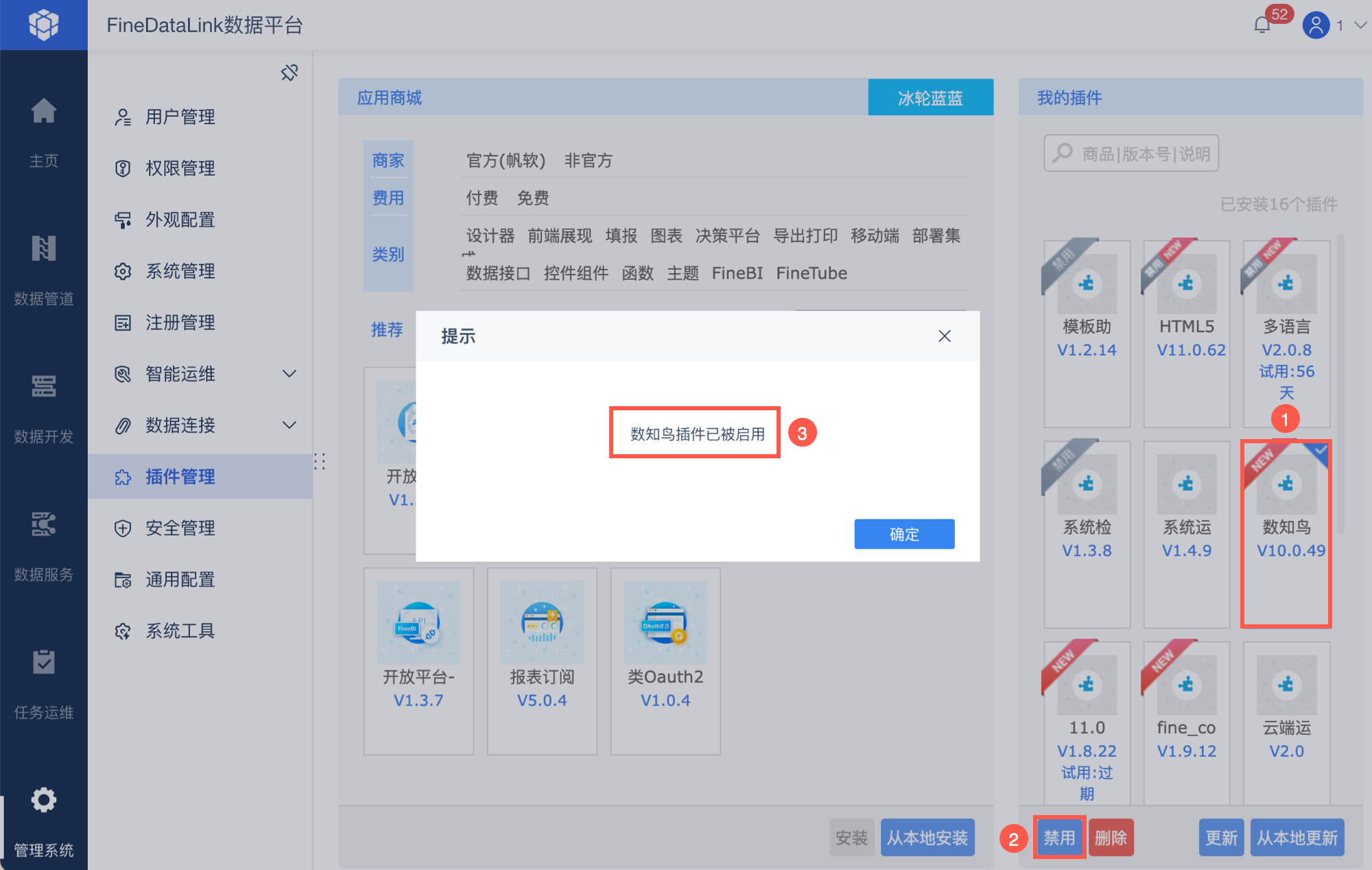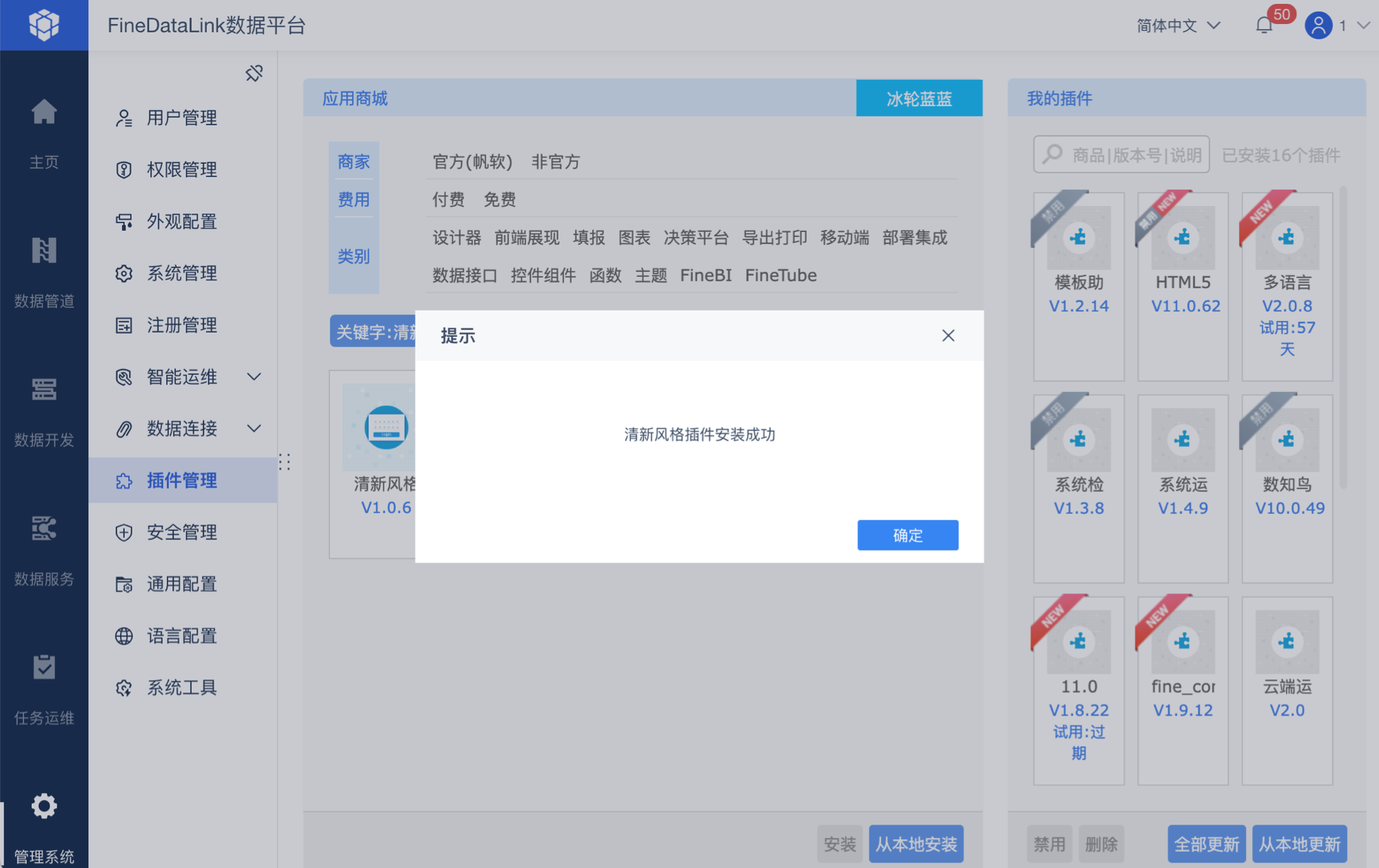 重启后,管理员登录 FineDataLink 数据平台,点击「管理系统>插件管理」,可看到插件已成功安装。如下图所示: