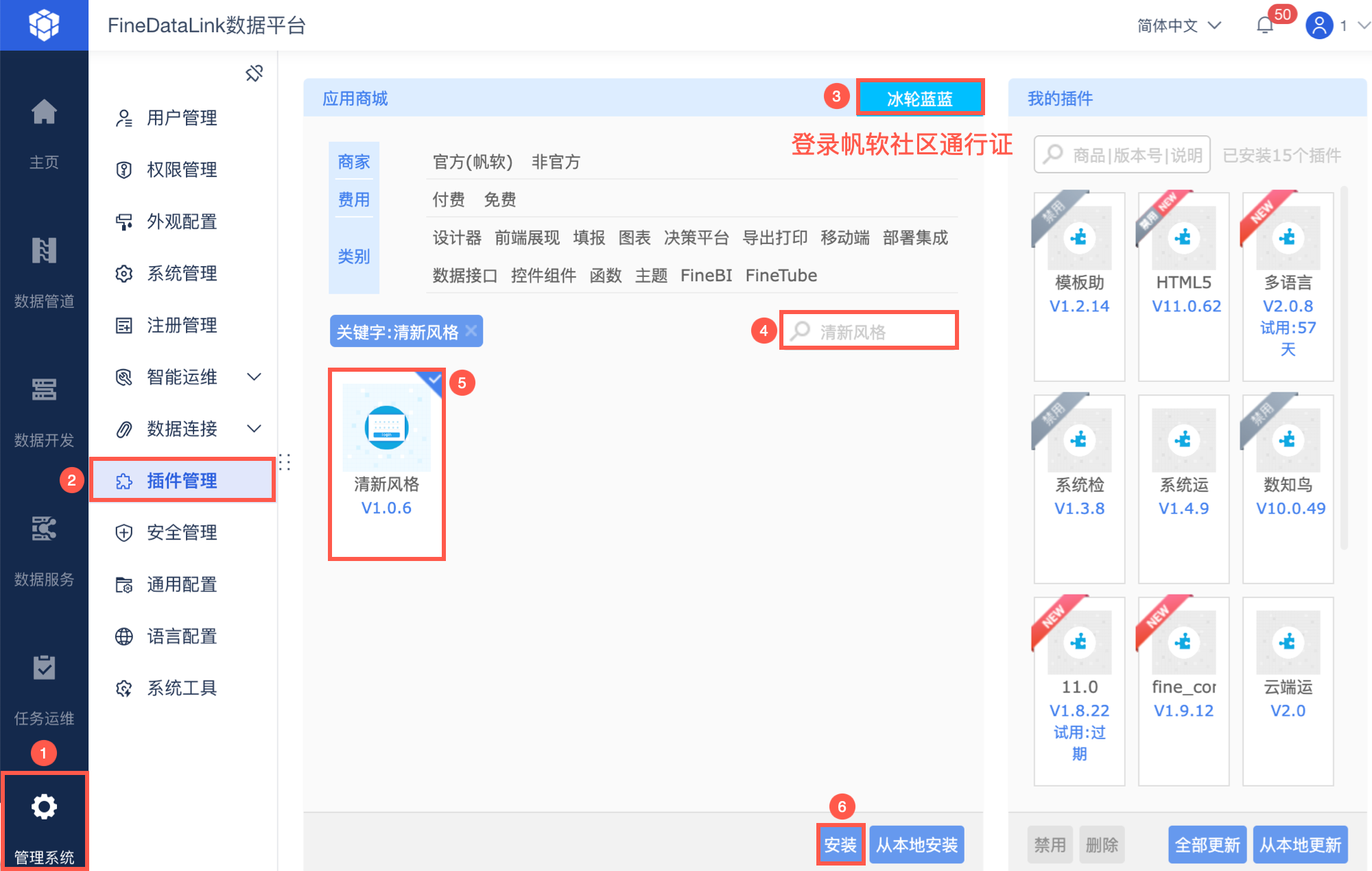 注:在帆软市场中需使用帆软通行证登录后,才能下载插件。