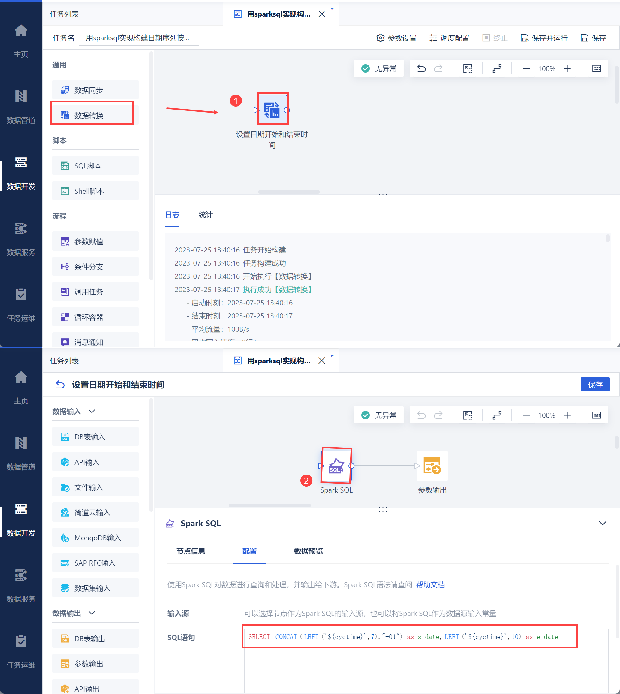 新建定时任务后,新增「数据转换」节点,进入编辑界面后新增「SparkSQL」算子,输入语句设置日期序列开始时间和结束时间,如下图所示: