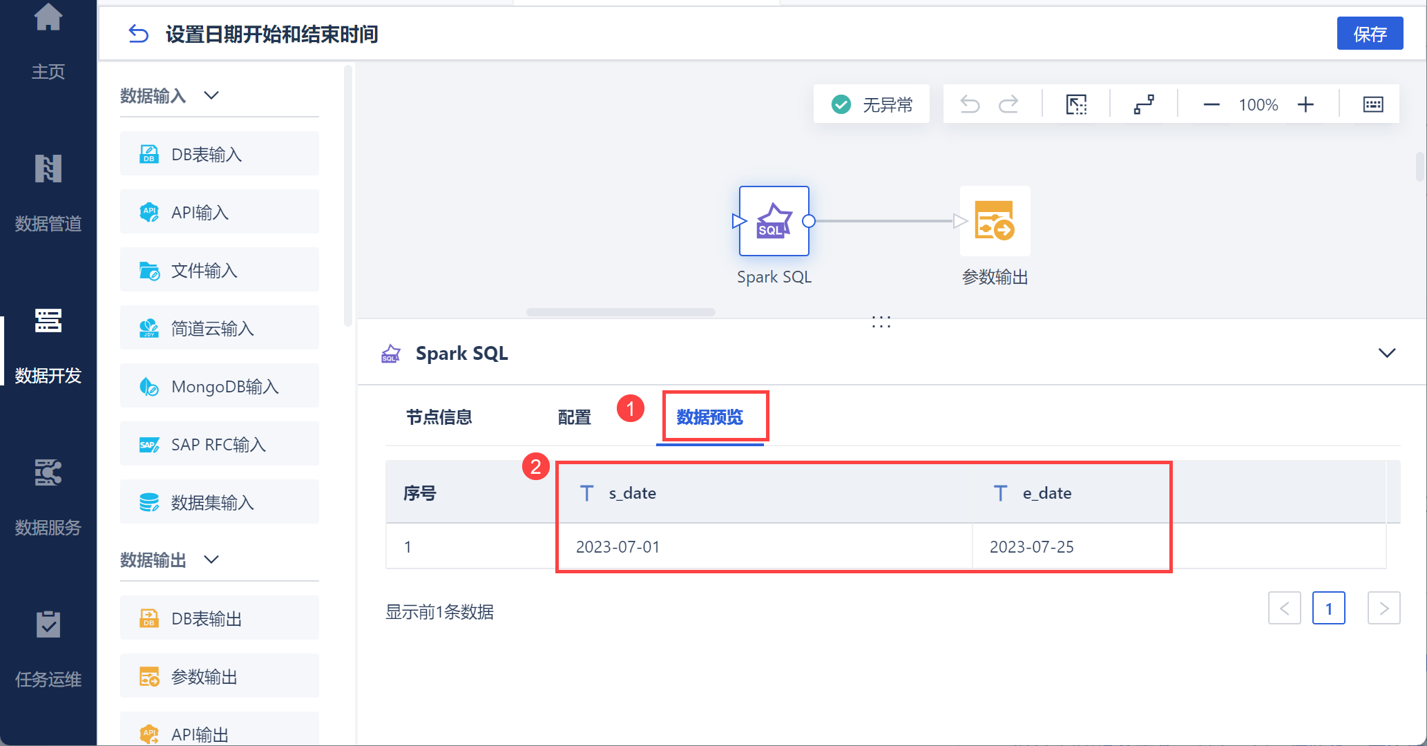新增「参数输出」算子,将设置的时间作为参数输出,便于后续使用开始时间和结束时间构建连续的日期列,如下图所示: